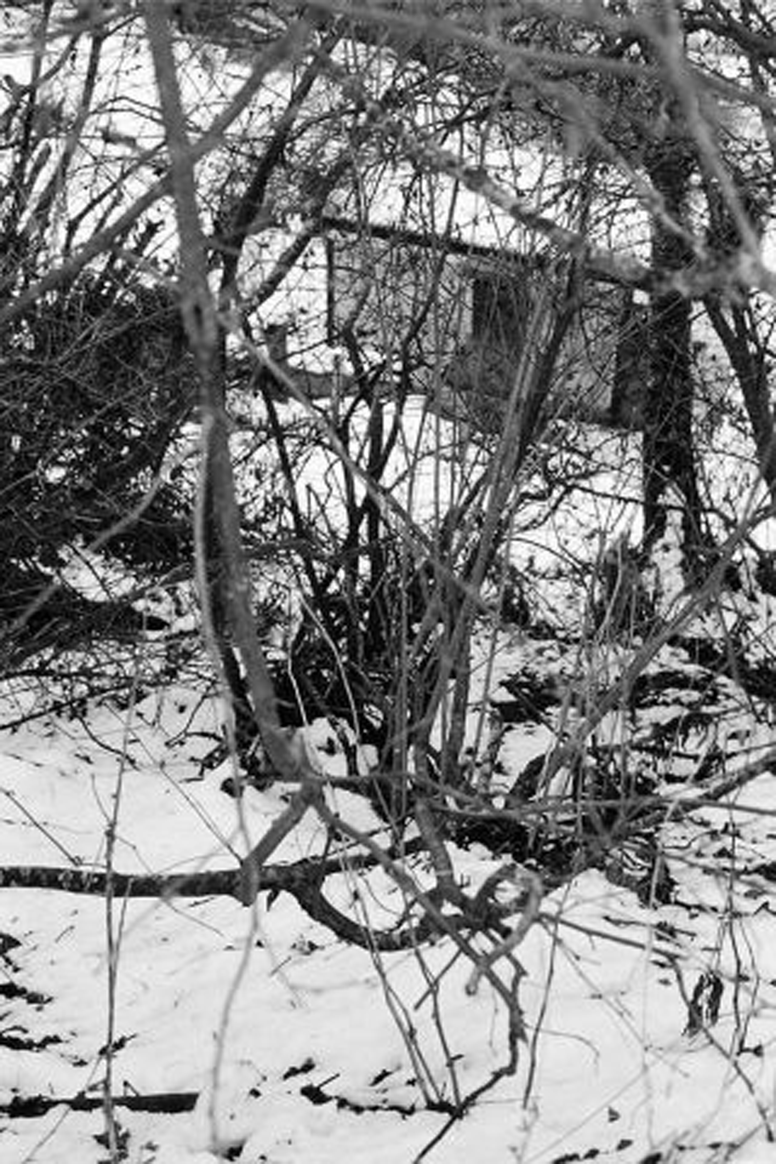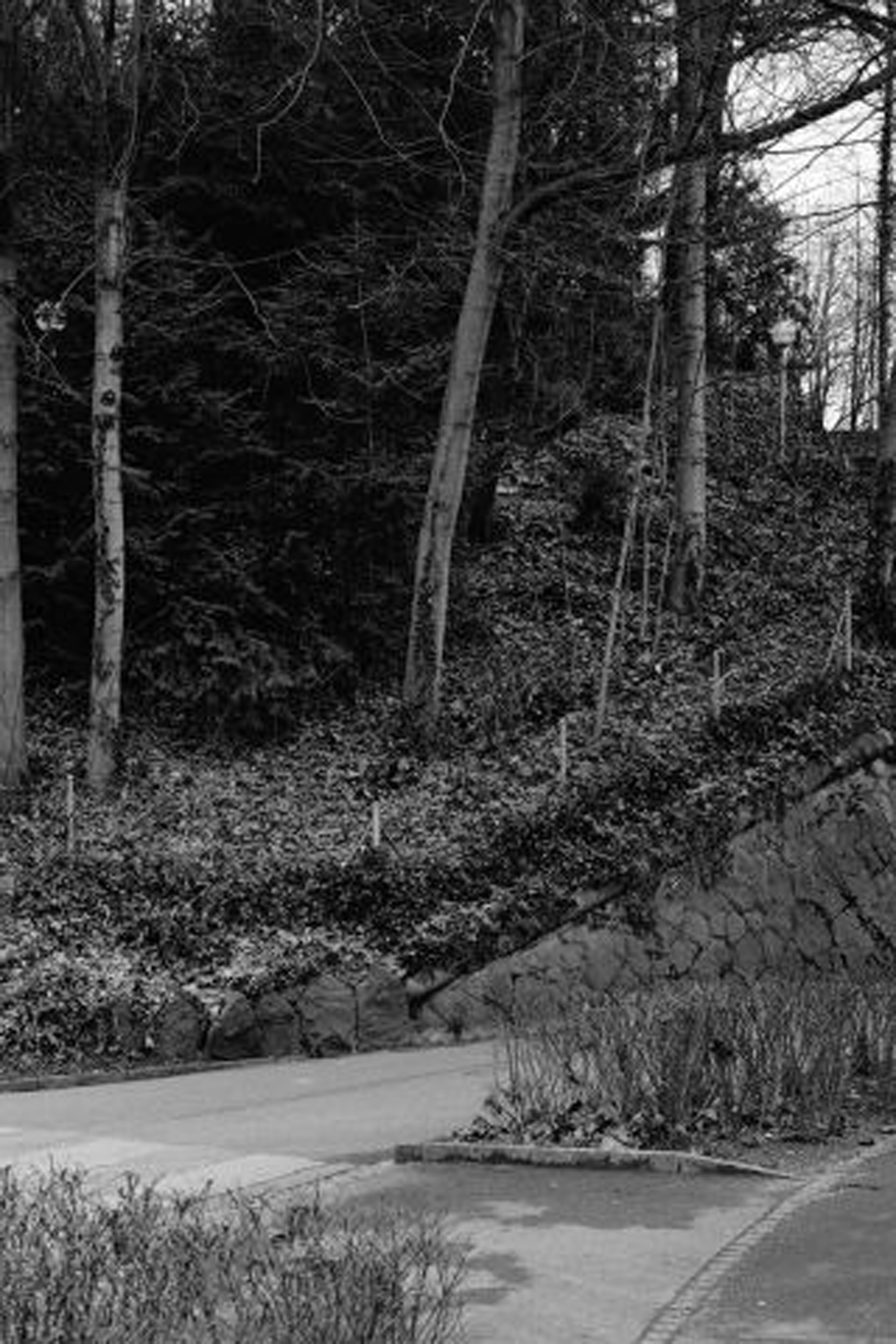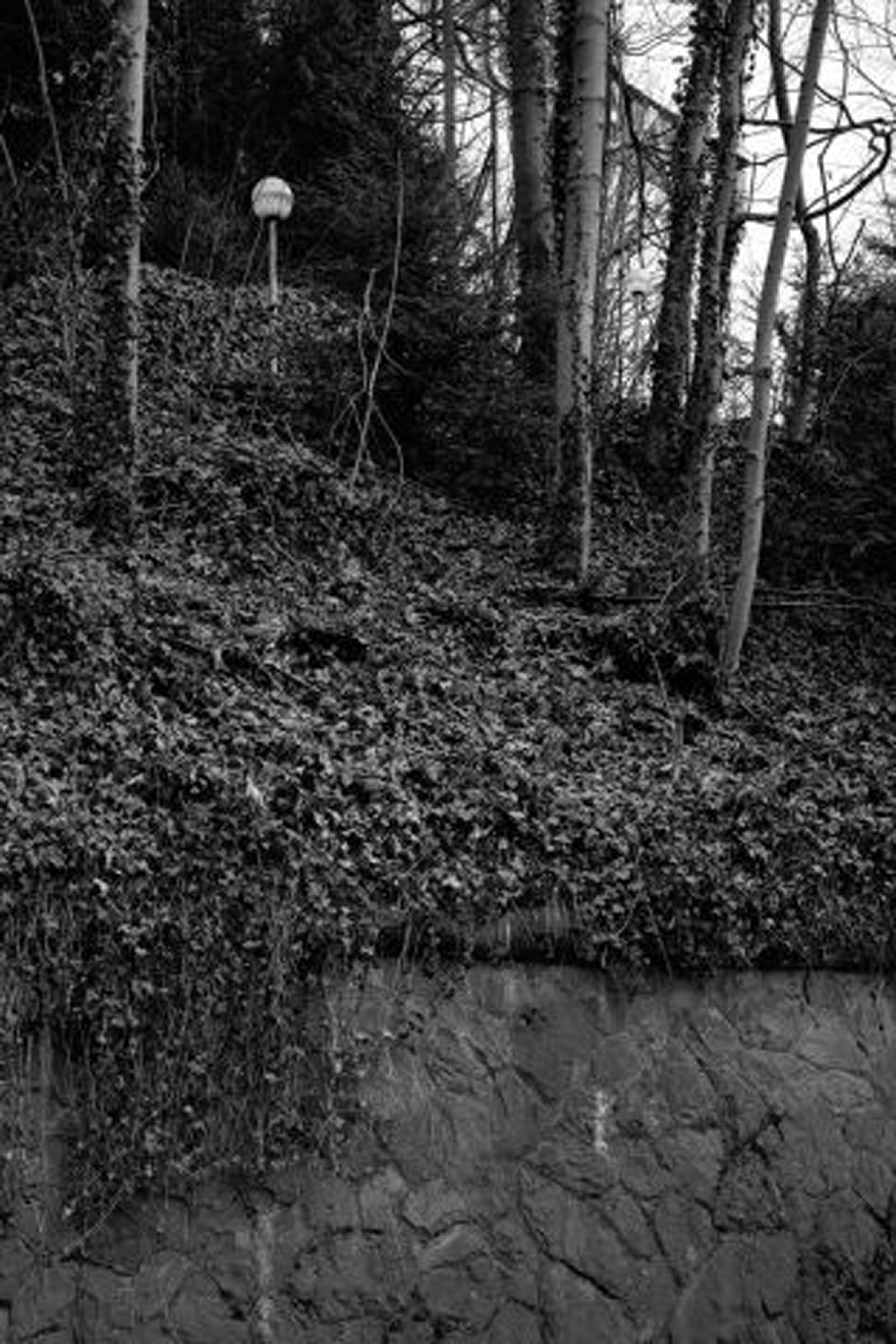 Hang und Neigung oszillieren fast durchgehend. Zuerst einmal gibt es in "Hang und Neigung 5" ein Dickicht, in dem sich nicht nur der Blick im filigranen Gewirr der Verästelungen verliert, sondern auch die körperliche Orientierung im Verhältnis zum Bildraum kippt. Der Anblick des Hanges ist im Foto fast Aufblick und verspricht als solcher eigentlich Überblick, unterläuft diesen aber gerade durch das Fehlen von Anhalts- oder Orientierungspunkten im gezeigten Landschaftsausschnitt.