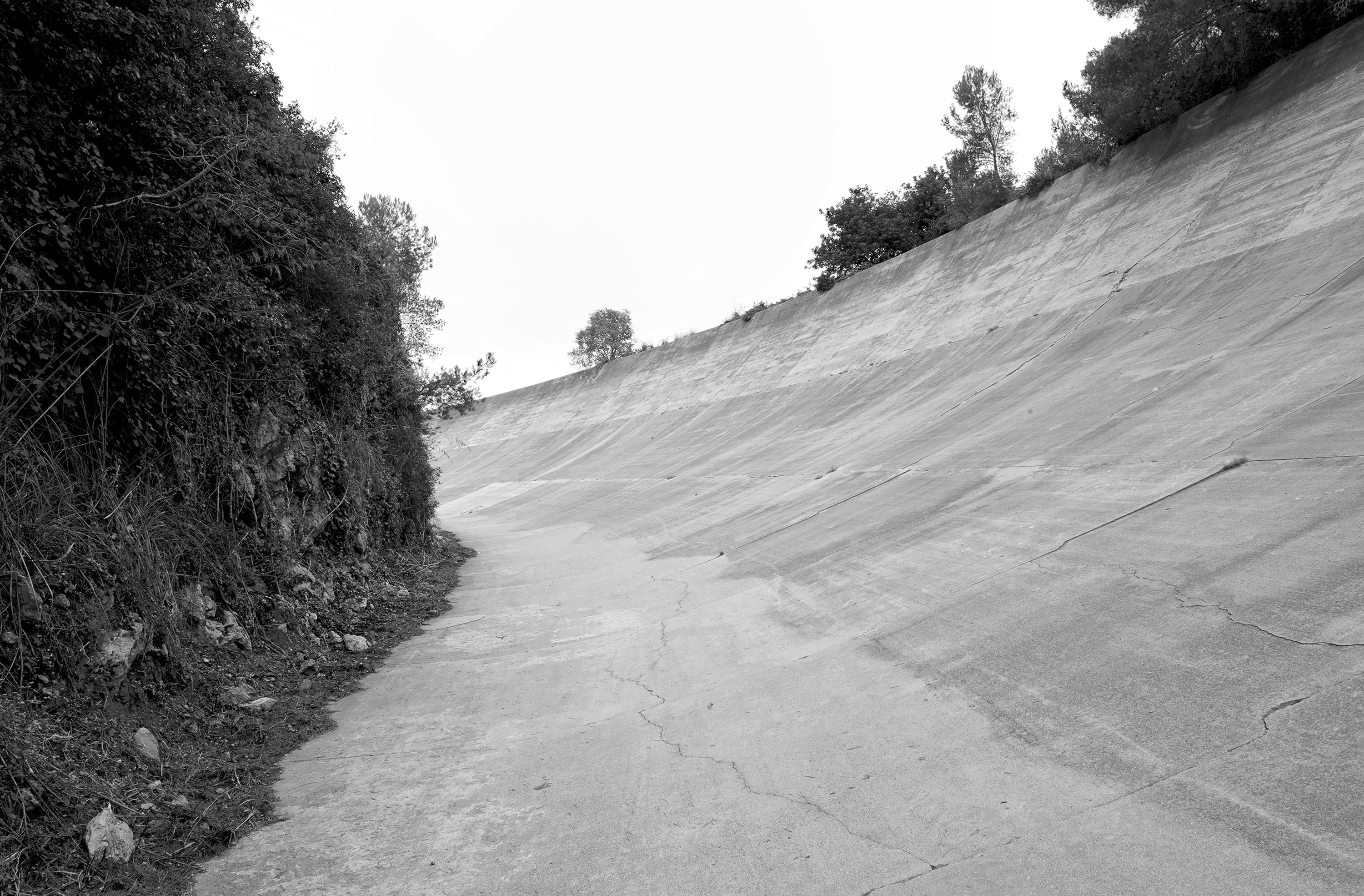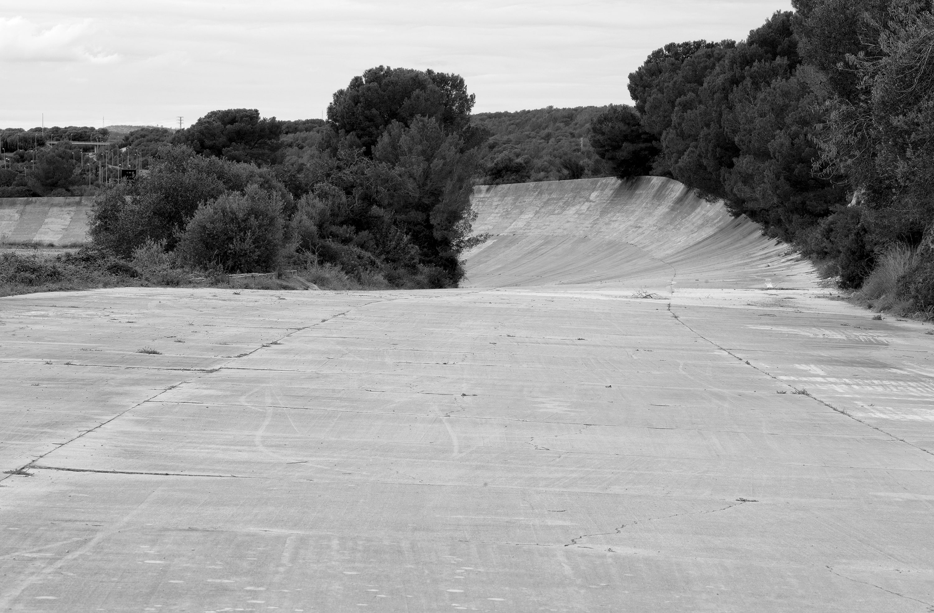 Aufnahmen im 2 km langen Circuit des Autodromo Nacional in Sitges, südlich von Barcelona. Dieser wurde 1922 erbaut, doch schon 3 Jahre später kaum mehr benutzt, da sich die Anlage wirtschaftlich nicht lohnte und bald auch den Anforderungen von neueren Autorennstrecken nicht mehr genügte. Dank der qualitativ hochwertigen Bauweise hält sich der Verfall der Anlage in Grenzen. Die Natur bricht jedoch an Rändern und in Ritzen herein. Mich interessiert die Differenz zwischen der Geschwindigkeit der plastischen Form der Rennstrecke und der stetigen Langsamkeit der Natur.