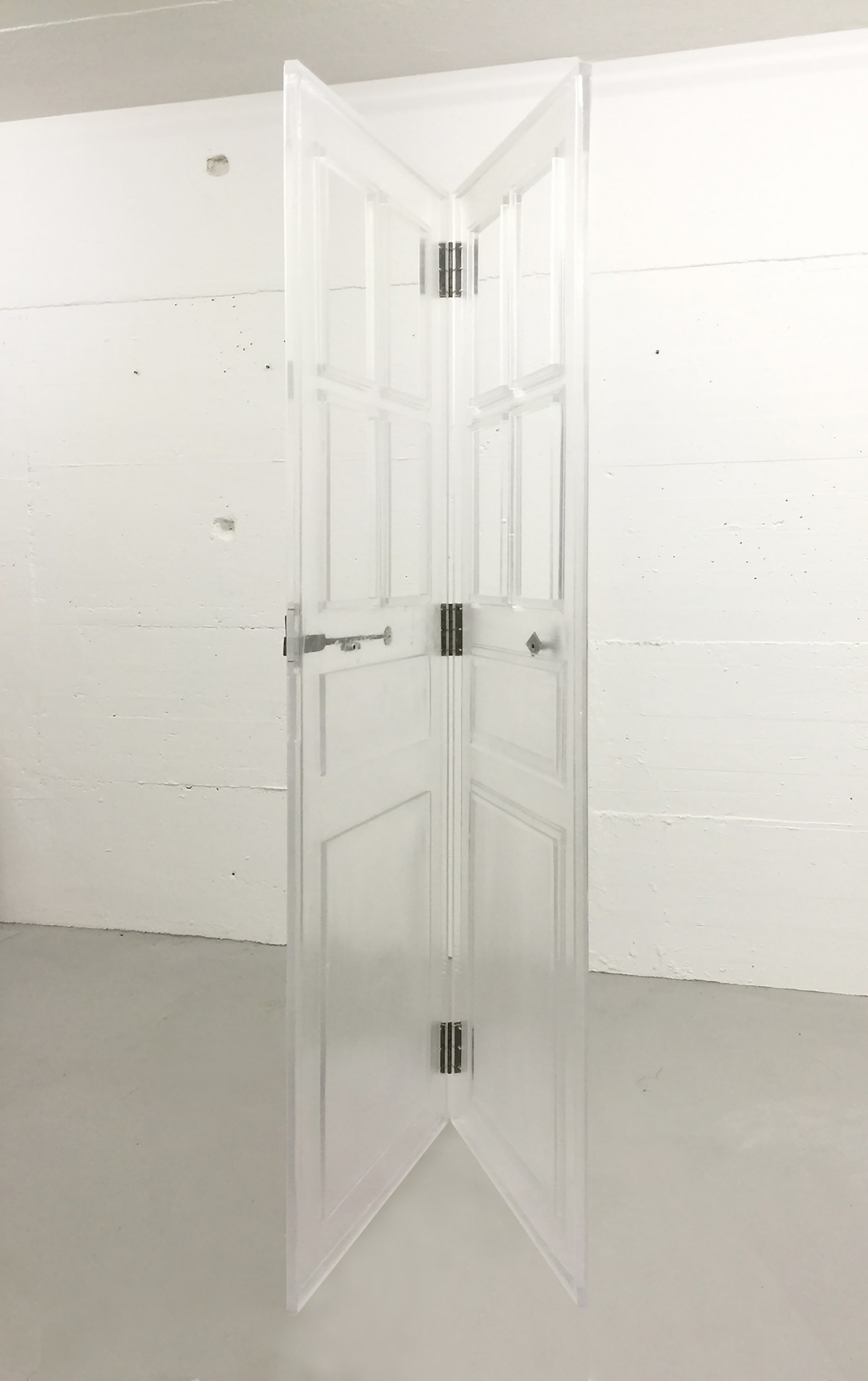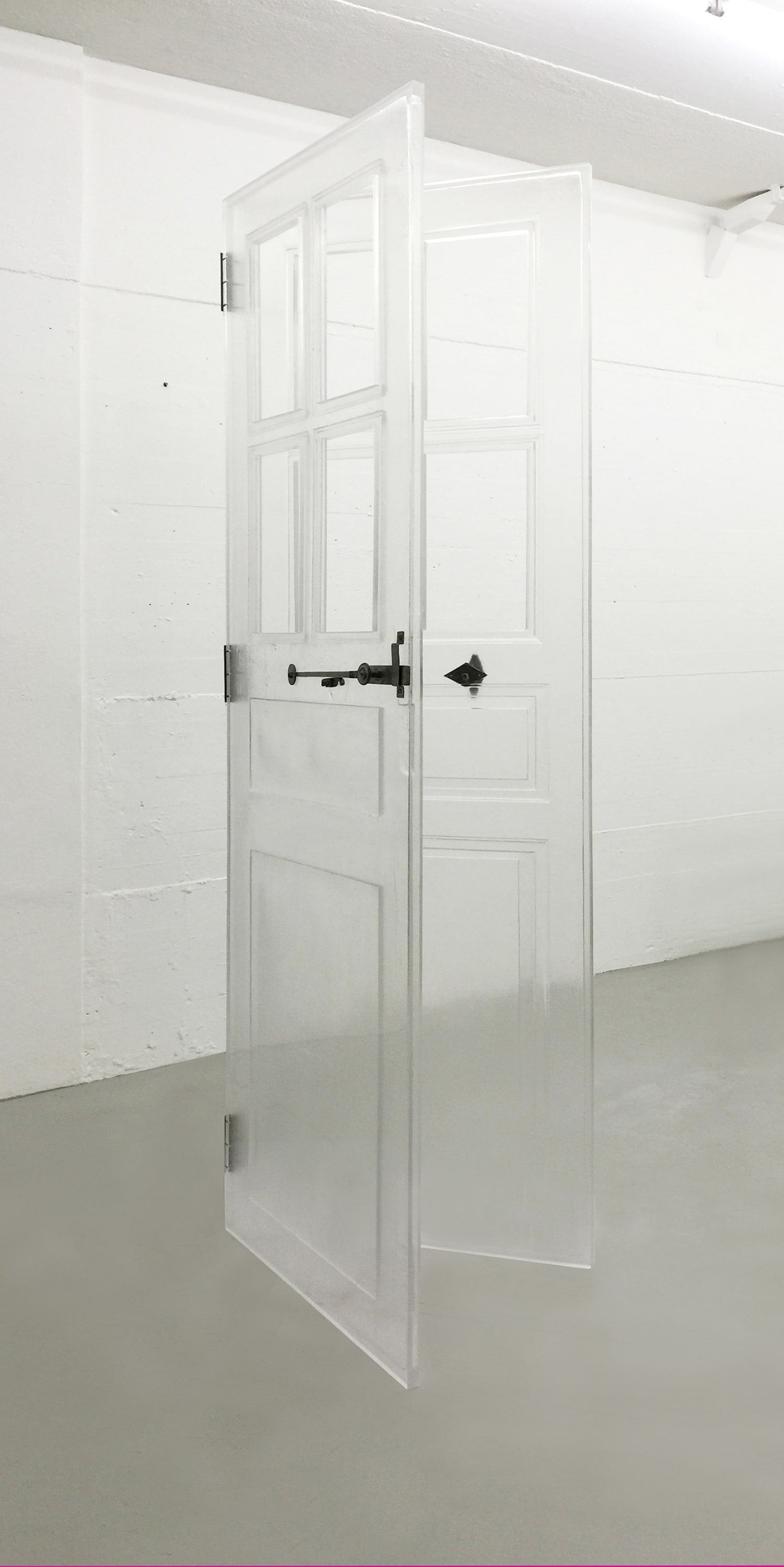 Von einer alten lackierten Holztür mit 4 Fensteröffnungen wurden alle Glasscheiben und Öffnungsvorrichtungen und Beschläge entfernt. Beide Seiten der Tür wurden danach mit transparentem Polyurethan abgeformt. Die beiden Gussteile, welche die Form der Tür auf der Innenseite nachbilden, wurden auf der Scharnierseite zusammengeführt und in einem Winkel von ca. 40º geöffnet. Die Originalbeschläge und Öffnungsvorrichtungen wurden wiederverwendet. Würden die gegossenen Teile geschlossen so fände sich im Innern die fehlende Tür. In dieser Stellung öffnet sich die Tür sozusagen auf sich selbst.