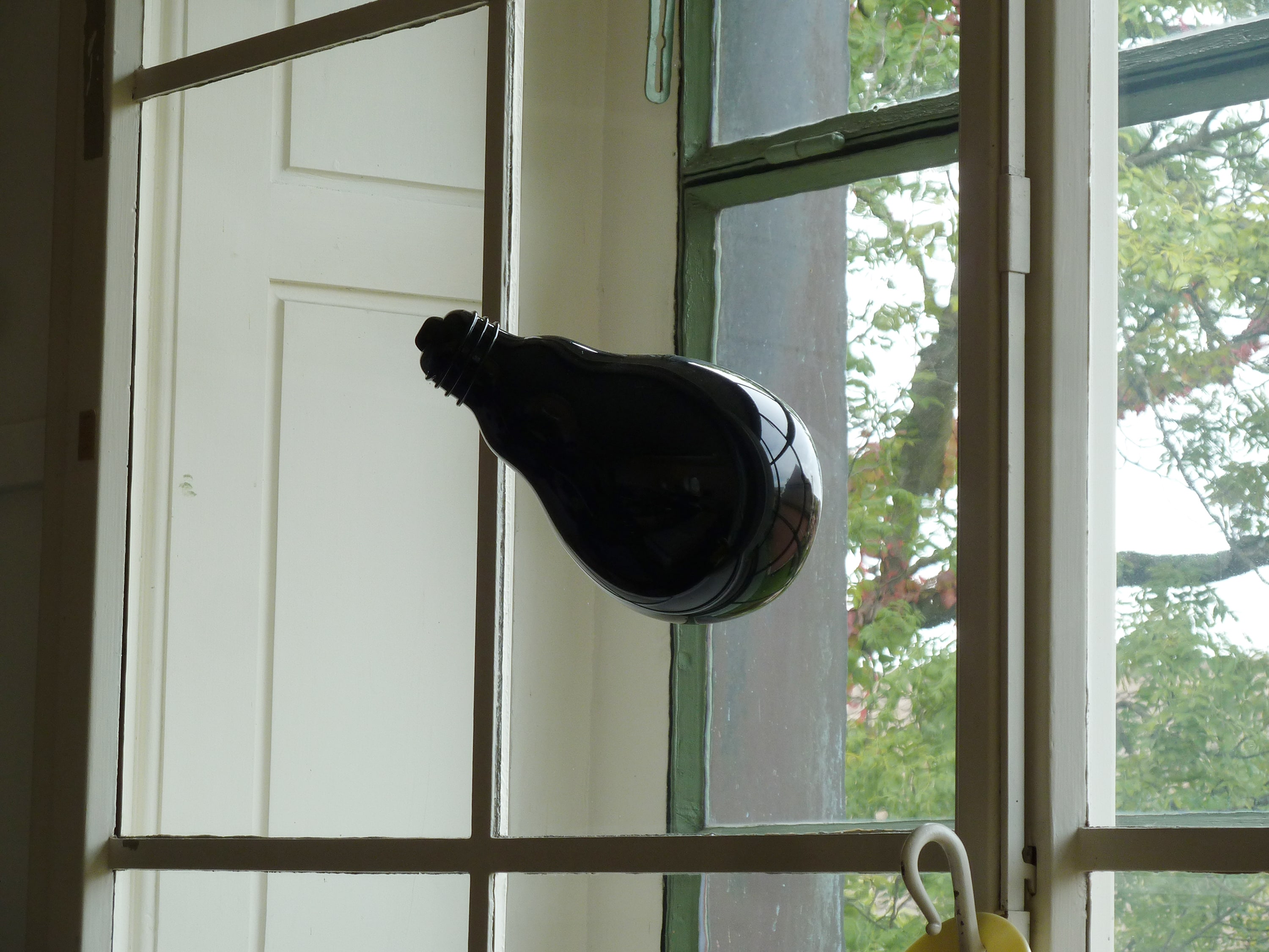 Mundgeblasene Form aus schwarzem Glas, einer Glühbirne ähnlich, mit abgeflachter Rundung. Sie kann mit der flachen Seite mittels kreisrundem Magnet auf einer Fensterscheibe angebracht werden, einfallendes Tageslicht streift Eclipse.