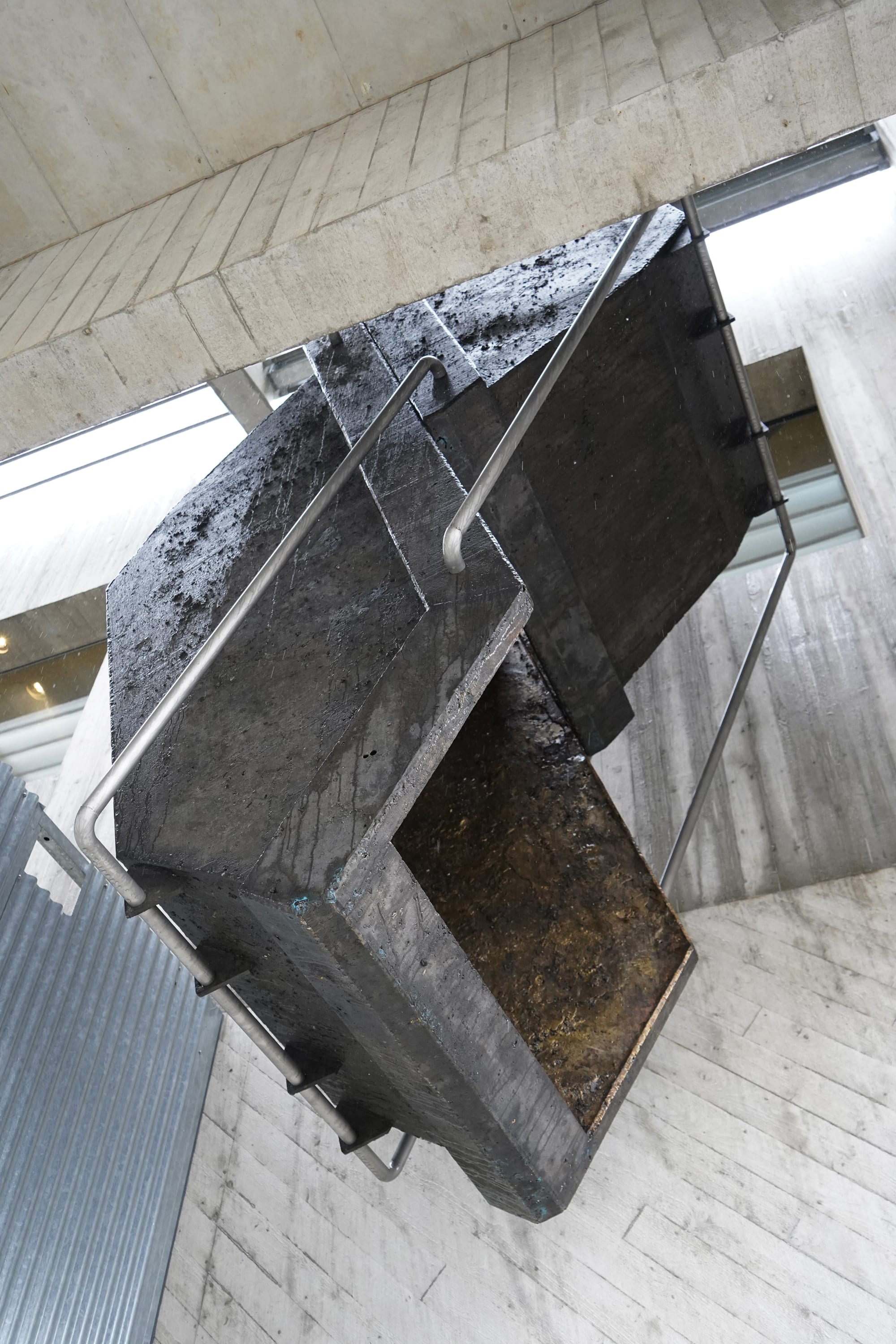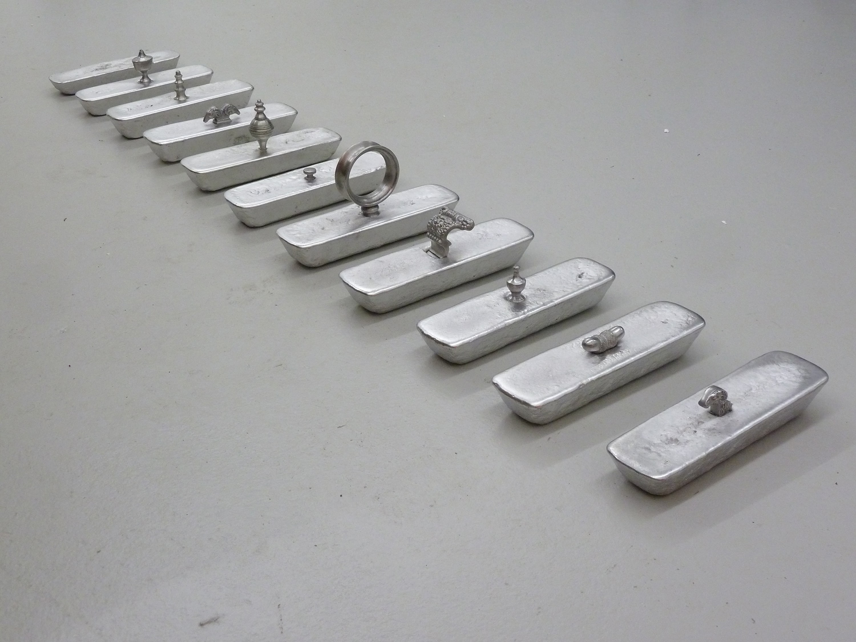 11 Zinnbarren mit integrierten Deckelfiguren von eingeschmolzenen Zinnkrügen, je 5 × 24 × 7 cm, Atelieransicht, 2013