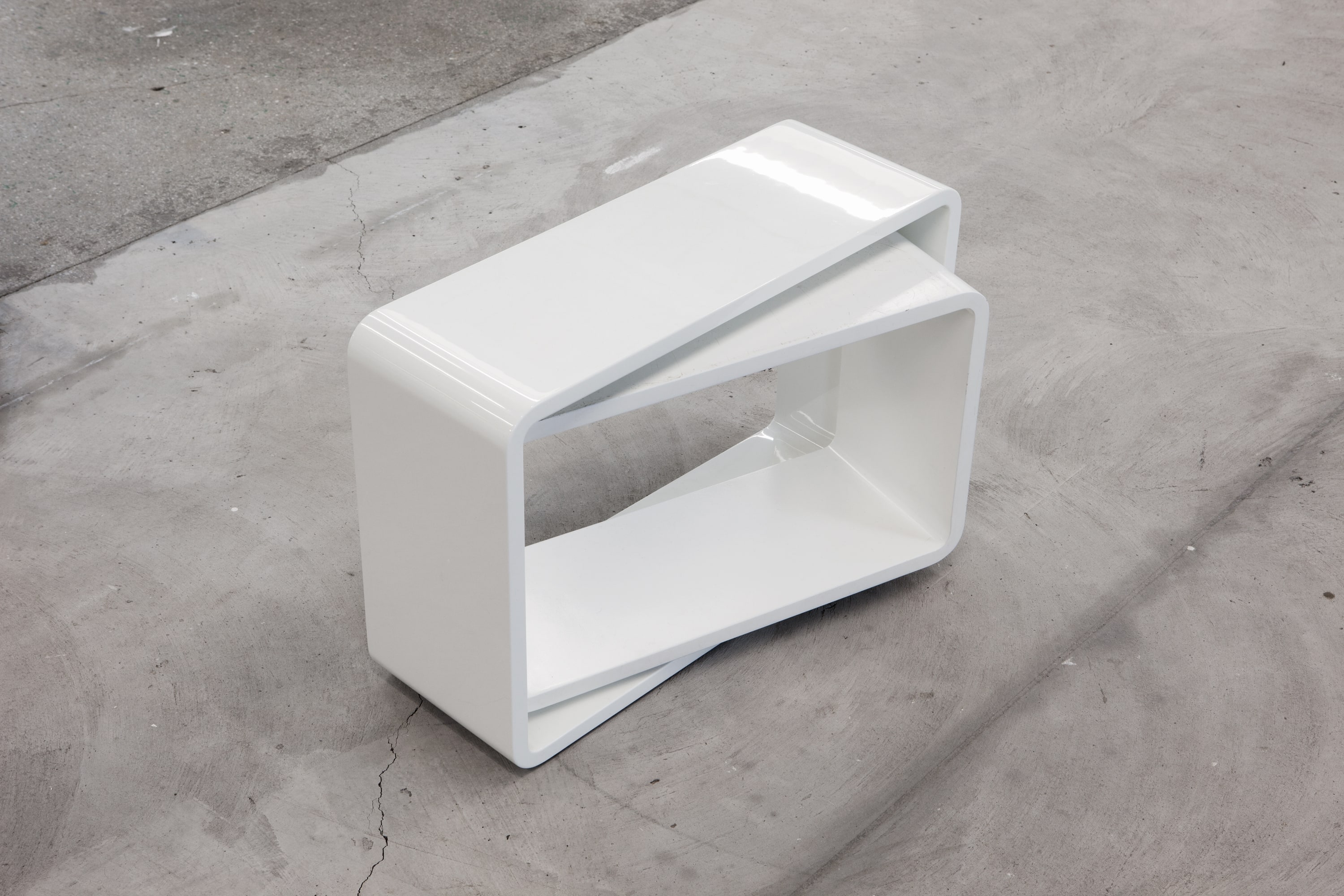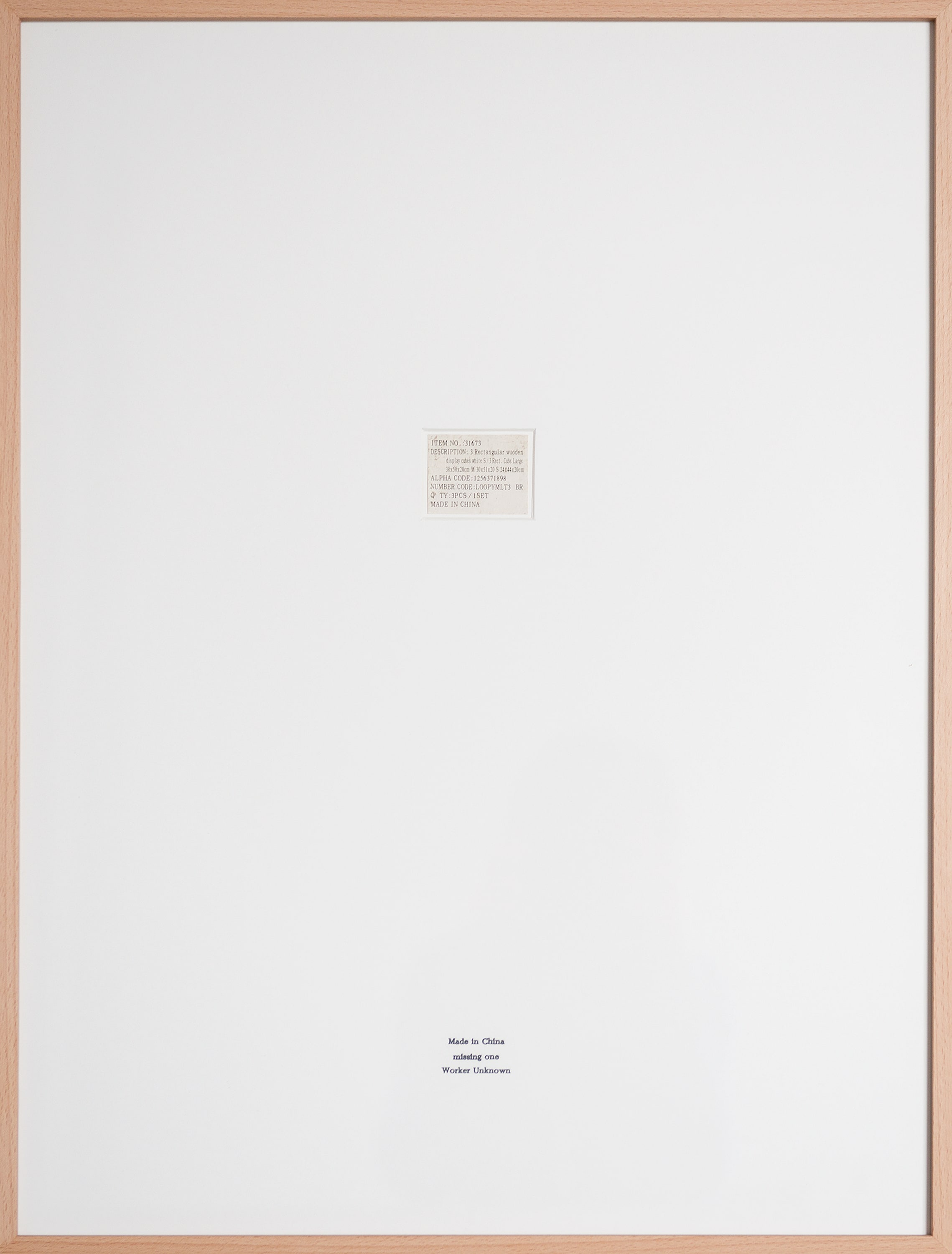 Zwei gebrauchte Beistelltische aus einem Satz von drei gefunden. Ein Etikett auf einem der beiden Tischchen verweist auf ein Dreier-Set und macht deutlich, dass eines fehlt. Das Etikett wurde entfernt und das Tischchen in der Originalfarbe neu gestrichen. Das andere wurde in seinem ursprünglichen Zustand belassen. Beide Tische wurden miteinander verschränkt ineinandergeschoben. - Das abgelöste Etikett wurde nach dem Prinzip des Kupferstichkabinetts in Basel gerahmt, mit Passepartout und eingravierter Aufschrift: Made in China, Missing one, Worker Unknown.