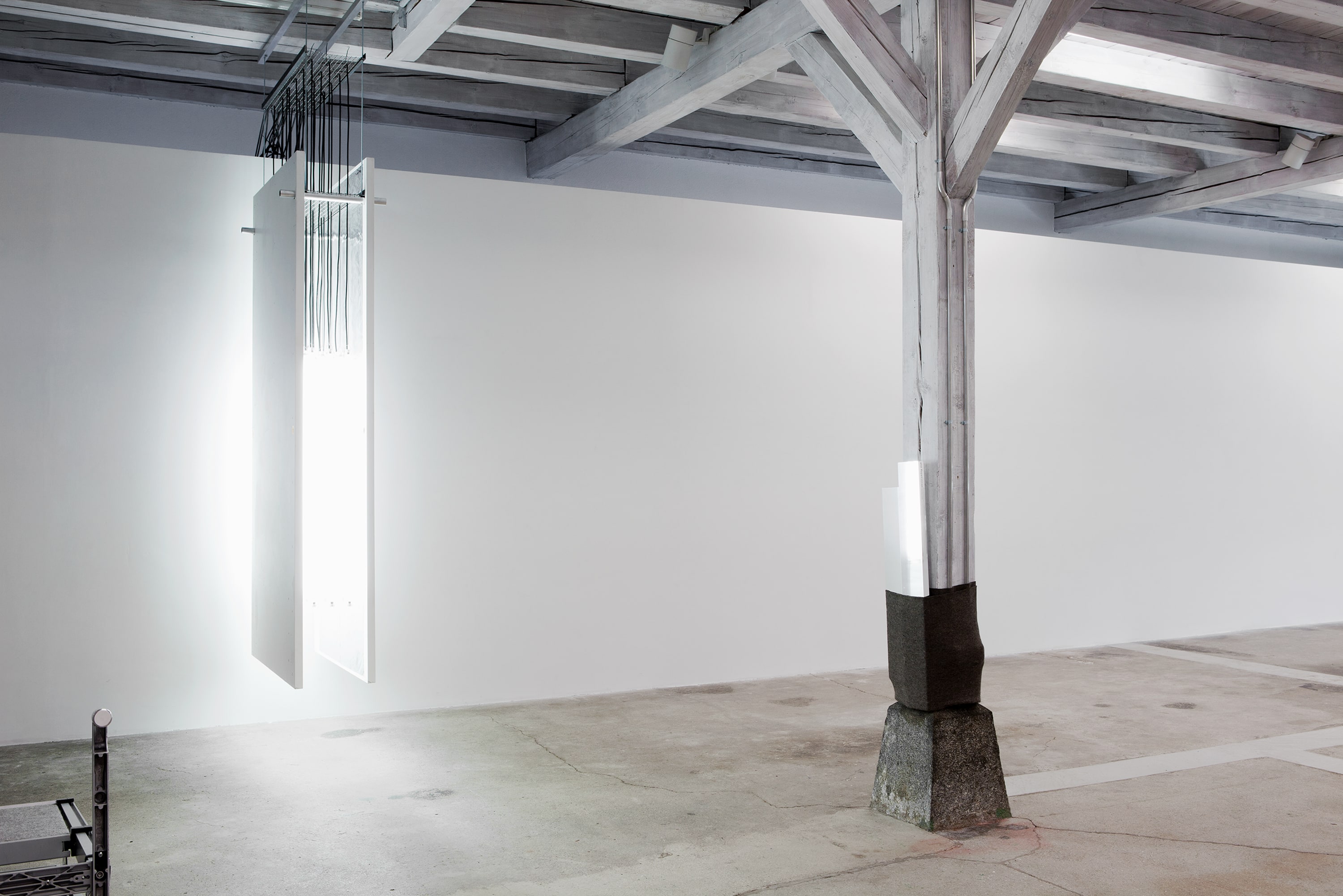 WALL SCAN 1, KZH in DROP OUT, 2013, Installation mit 2 Ausstellungswandplatten aus KZH, Neonleuchten, Kabel, Silberpapier, Metallkonstruktion, Masse variabel © Conradin Frei