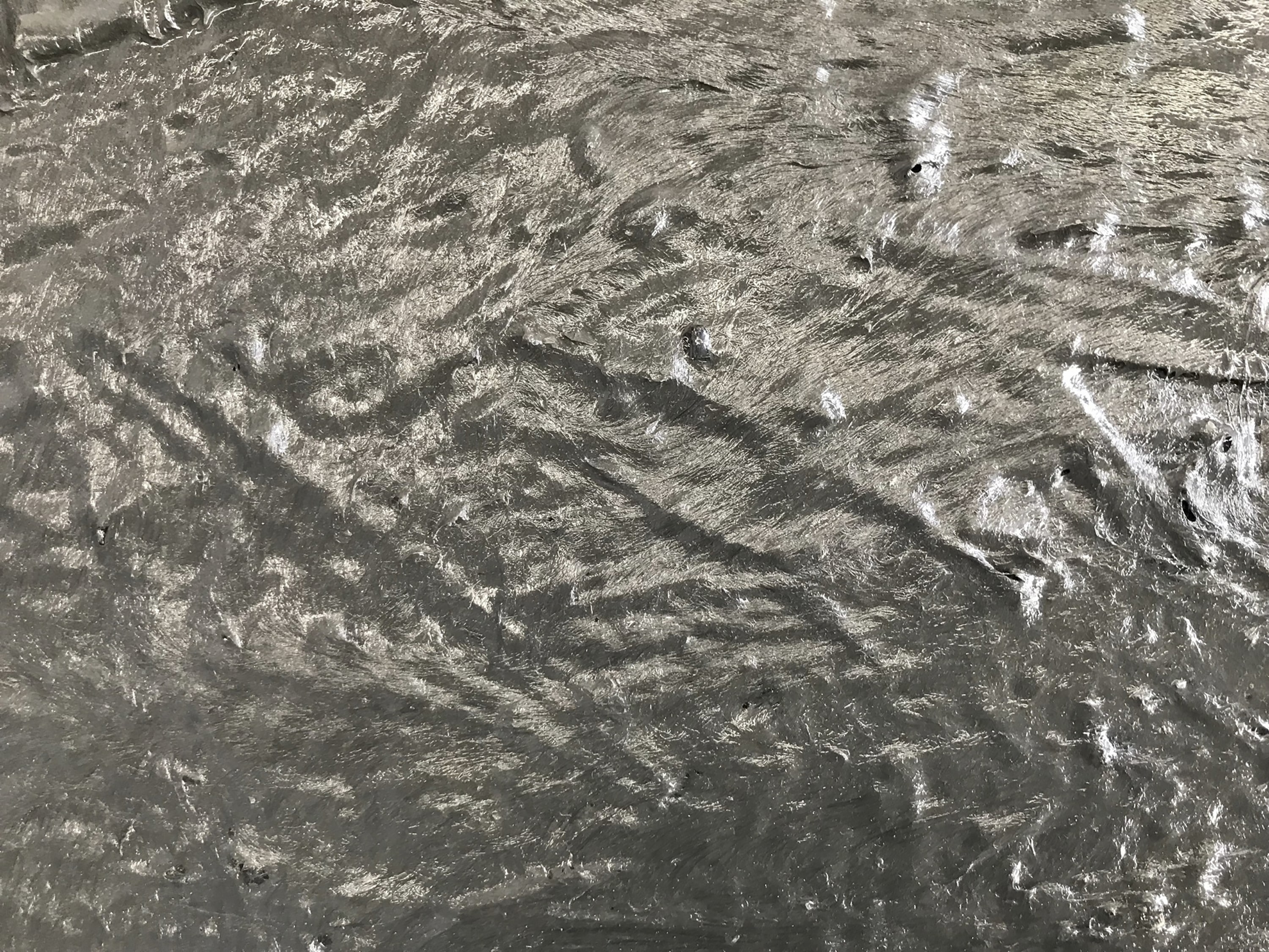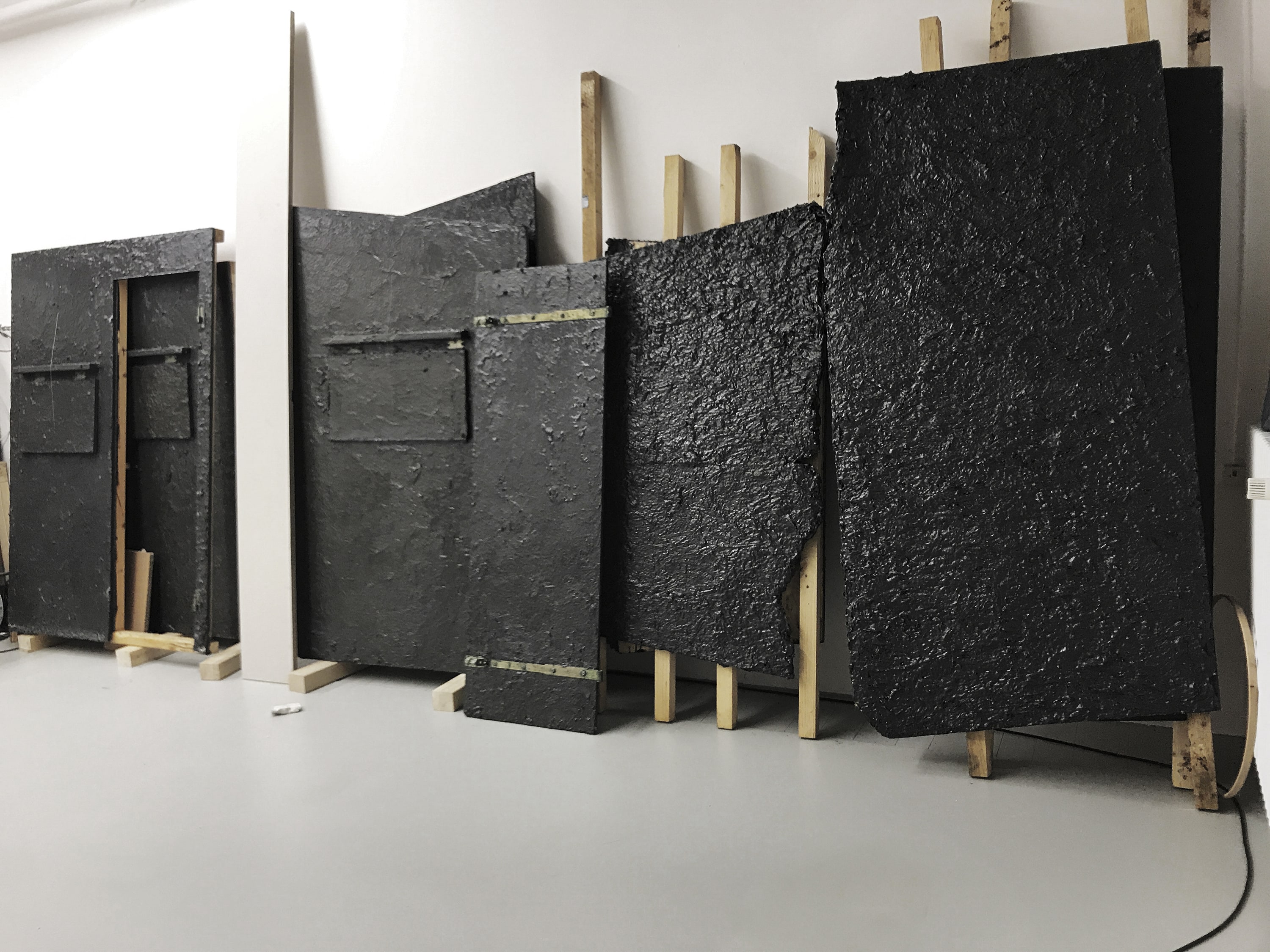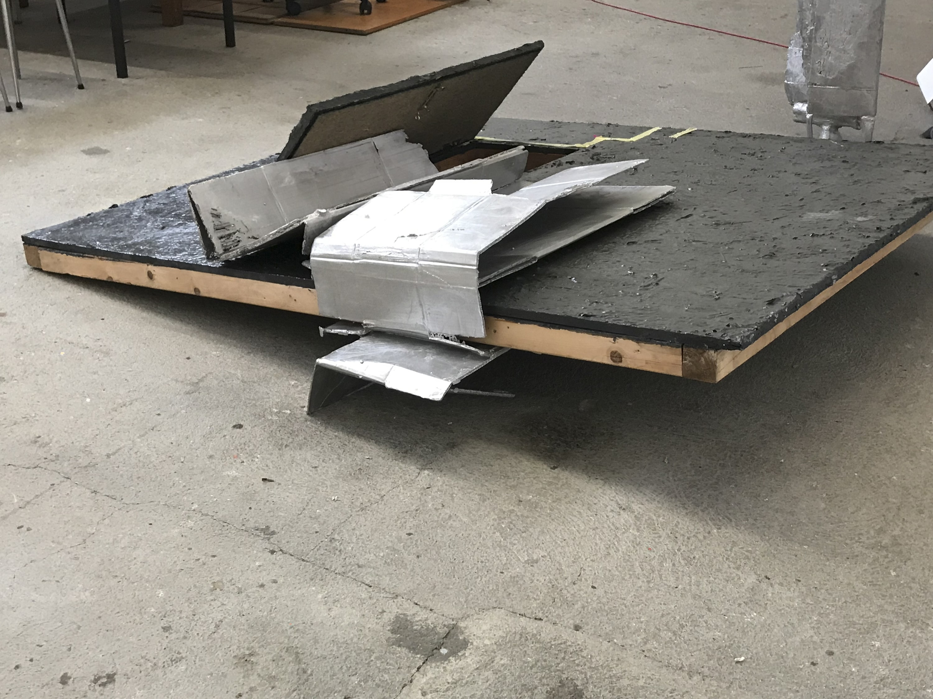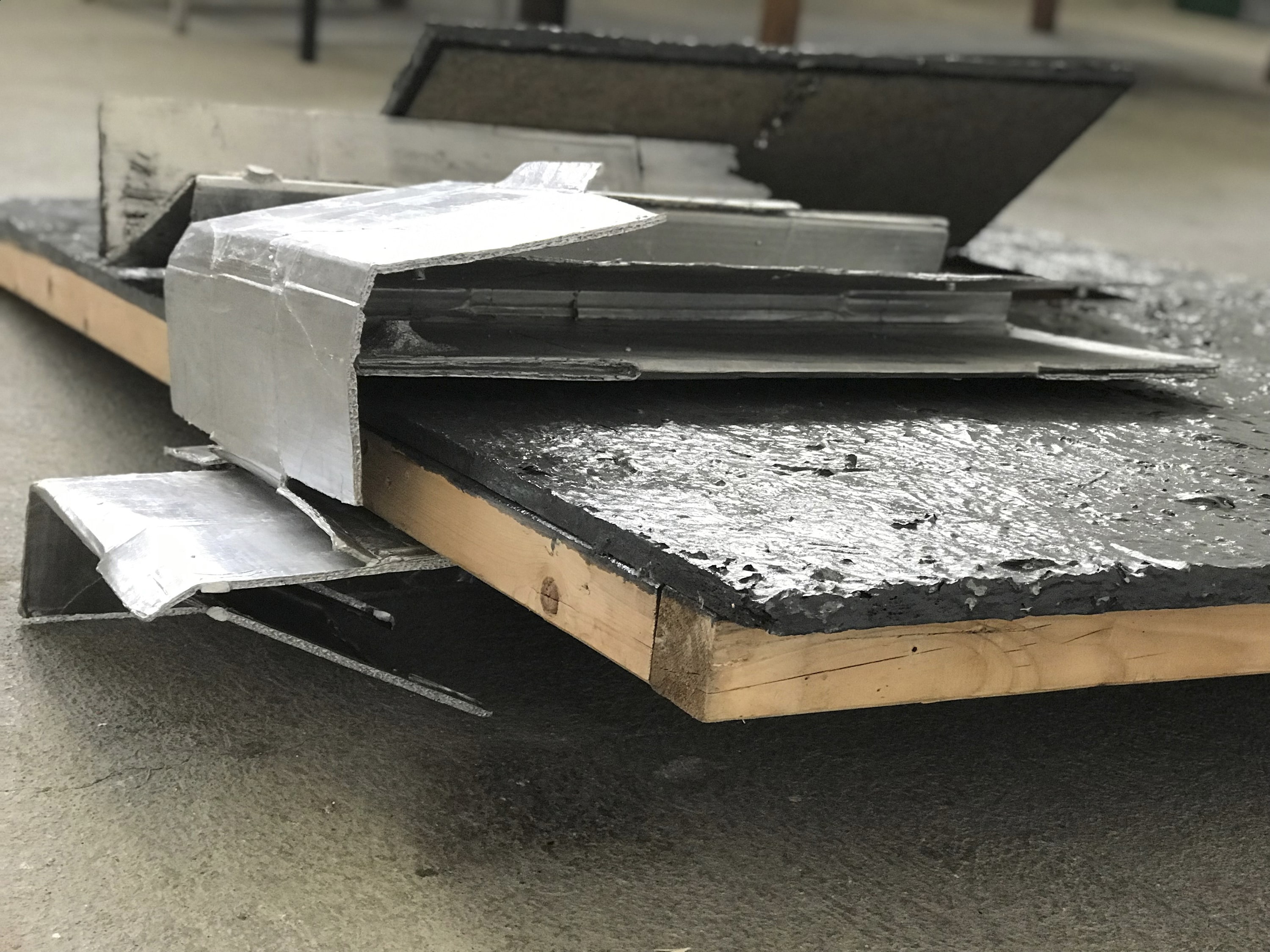 Part of hunting stand with stealth coating, wood, felt, plexi, epoxy with radar-repellent ingredients, aluminium cast of card board construction, 33 × 183 × 150 cm © Ilona Ruegg