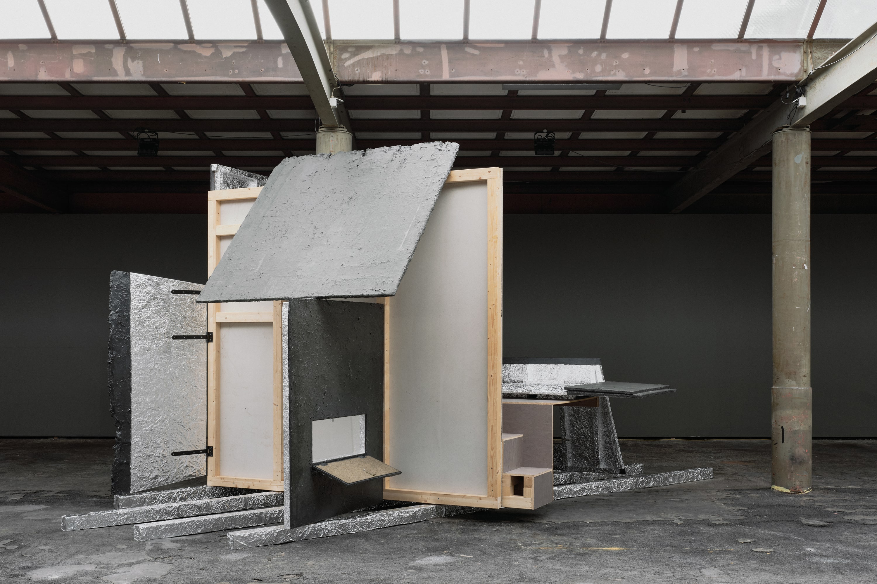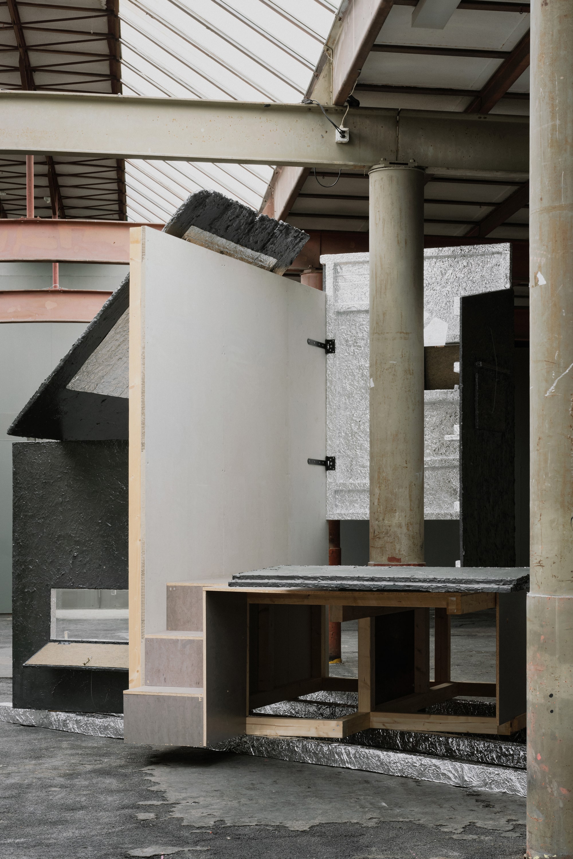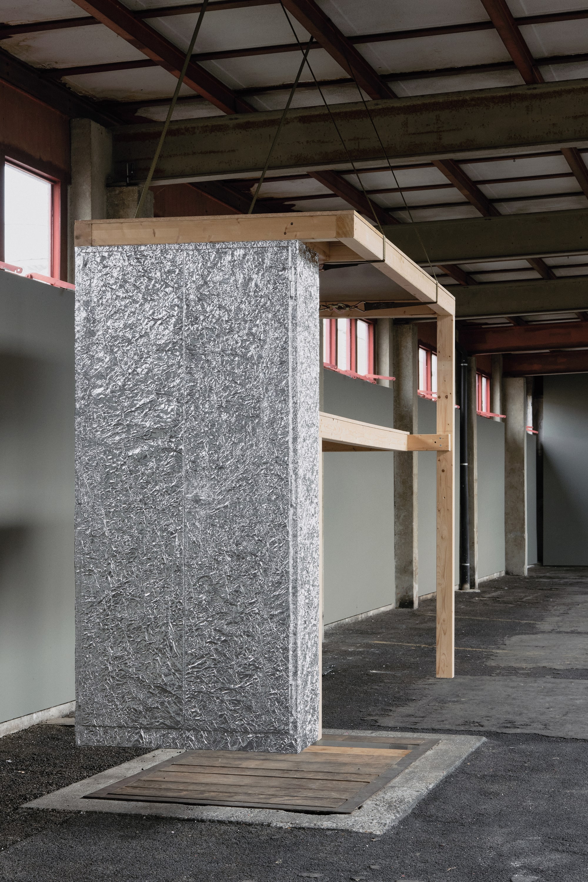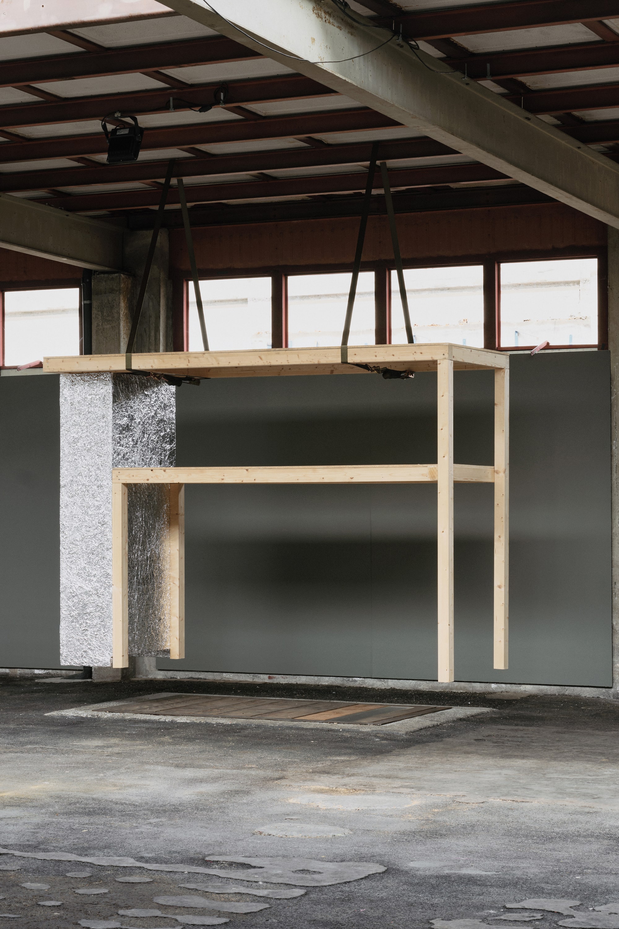 The exhibition fell within the period of my studio move from the Rote Fabrik and deals with spatial overlaps. Two elevated constructions are moved into the Kunsthalle: my elevated work platform with back wall from the studio and the loose parts of a hunting stand from a forest. The result is a hybrid construction of both, in which a column of the Kunsthalle is also being integrated. Questions arise about the conditions of showing, producing, interpreting, (mentally) transferring and (physically) migrating. The shifts reveal possibilities of seeing, thinking and feeling with one's own body what other people may experience, who have to leave places in pain and invent new places first. However, the starting point is my own living environment and field of thought, in order to think about these social questions in a plastic way with concrete material.