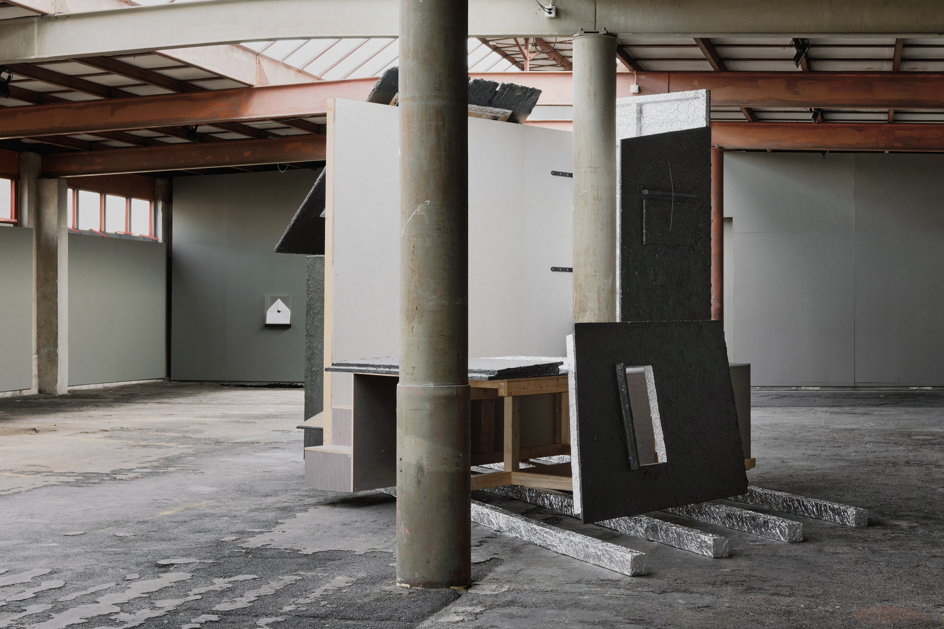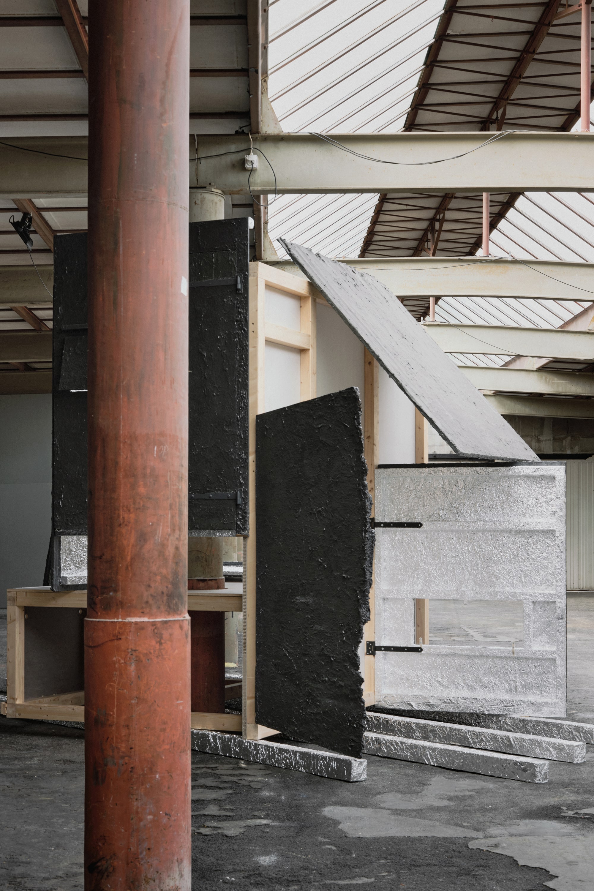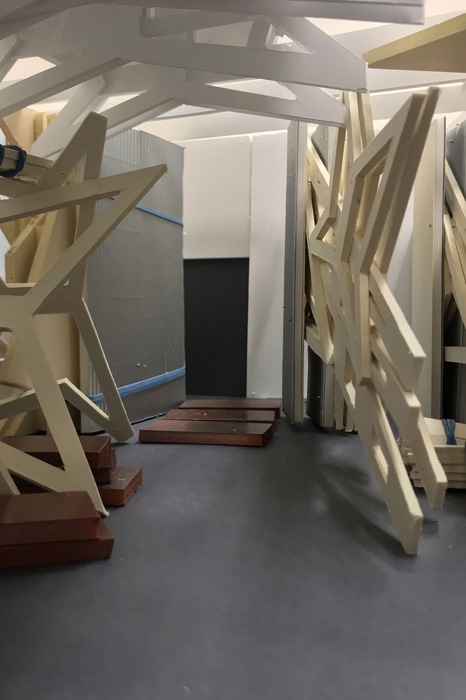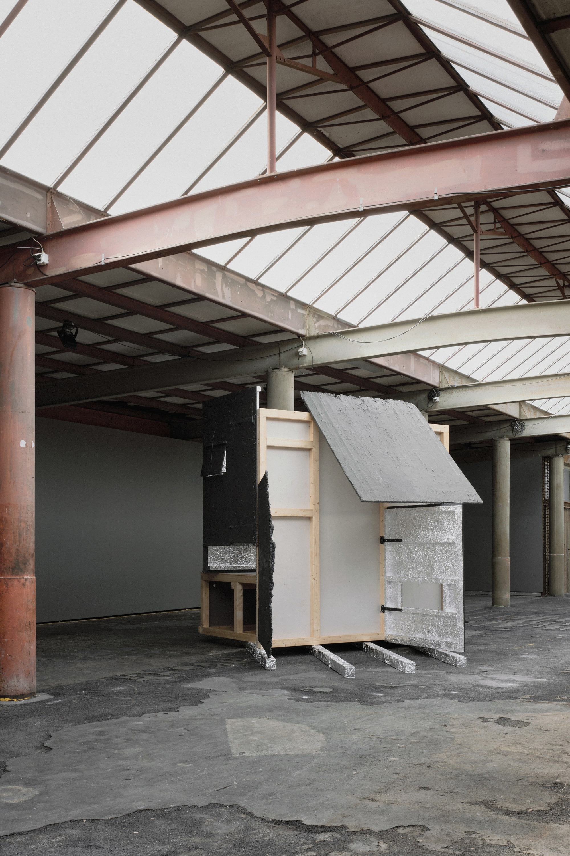 The exhibition fell within the period of my studio move from the Rote Fabrik and deals with spatial overlaps. Two elevated constructions are moved into the Kunsthalle: my elevated work platform with back wall from the studio and the loose parts of a hunting stand from a forest. The result is a hybrid construction of both, in which a column of the Kunsthalle is also being integrated. Questions arise about the conditions of showing, producing, interpreting, (mentally) transferring and (physically) migrating. The shifts reveal possibilities of seeing, thinking and feeling with one's own body what other people may experience, who have to leave places in pain and invent new places first. However, the starting point is my own living environment and field of thought, in order to think about these social questions in a plastic way with concrete material.