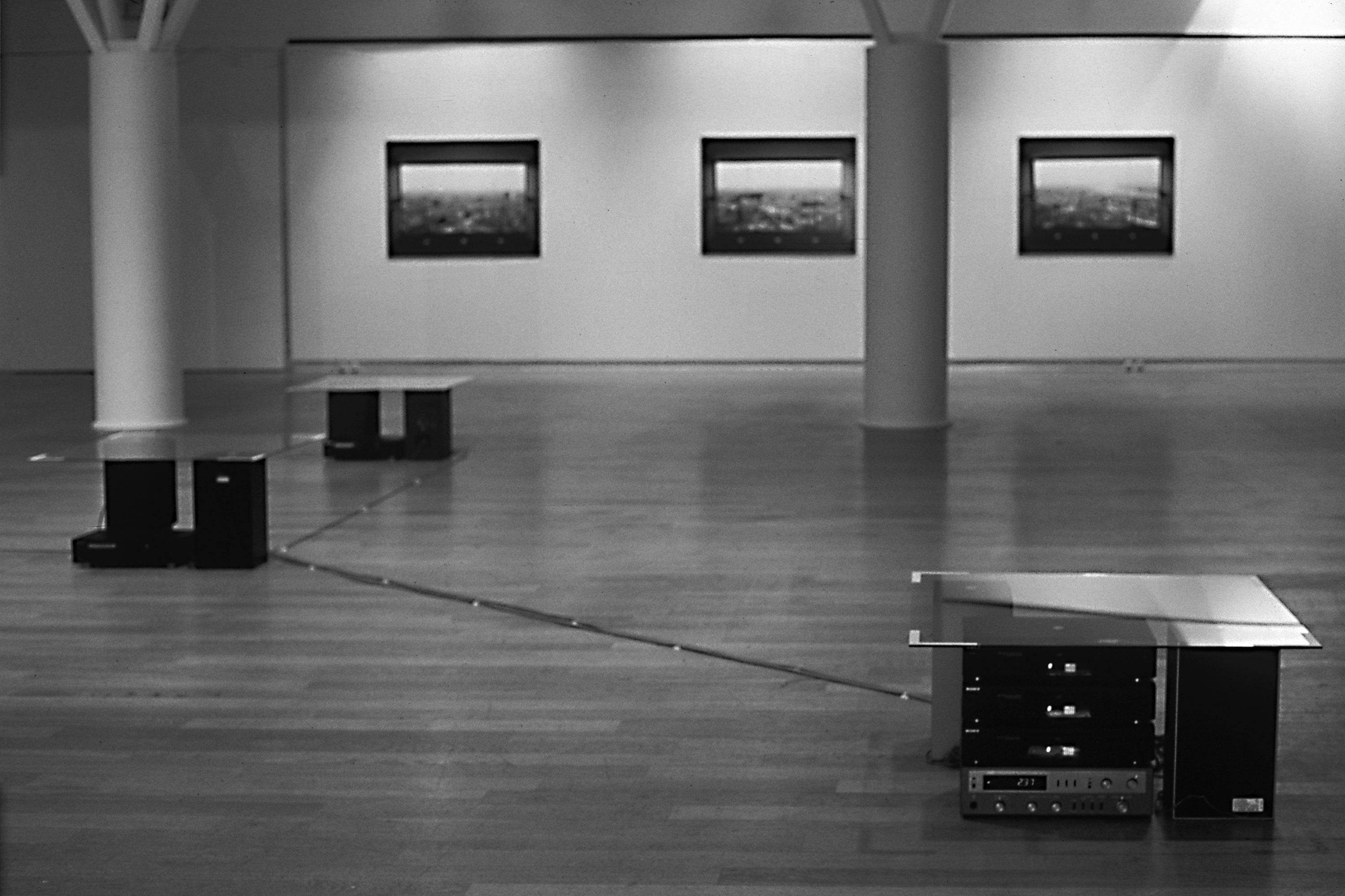 Installation: CD-player, amplifier, loud speakers, voice piece on 4 channels, in the background works of Koenraad Dedobbeleer