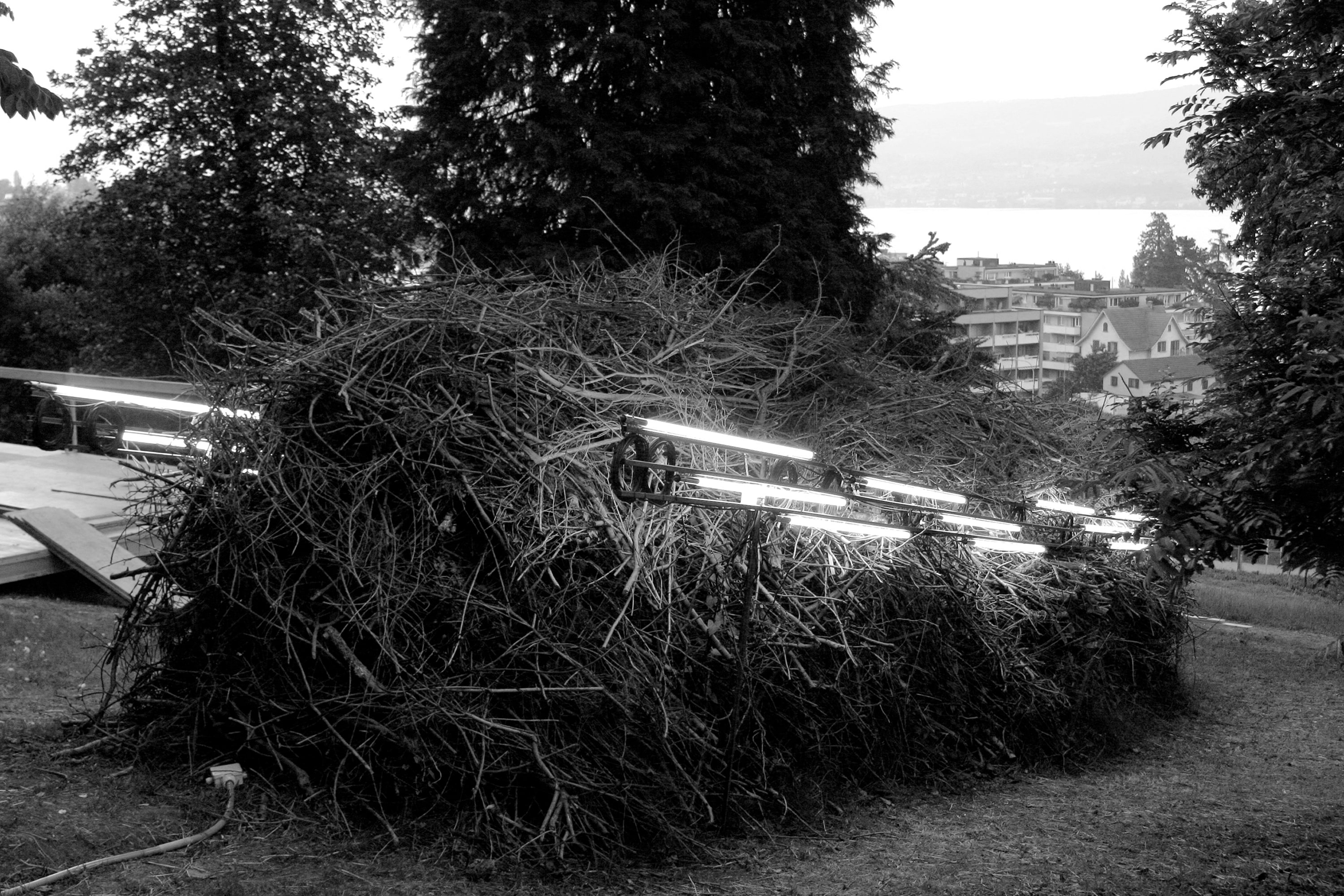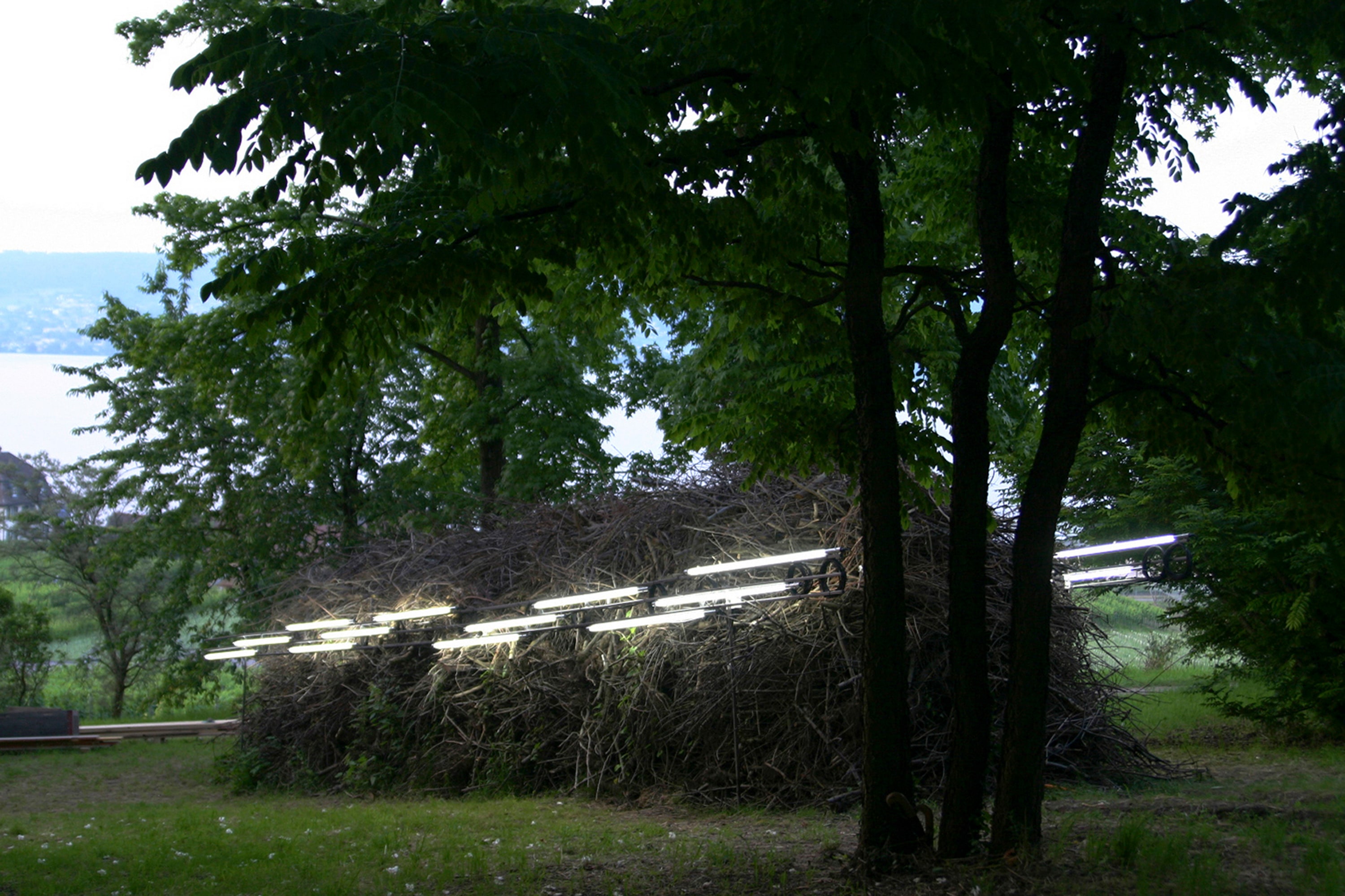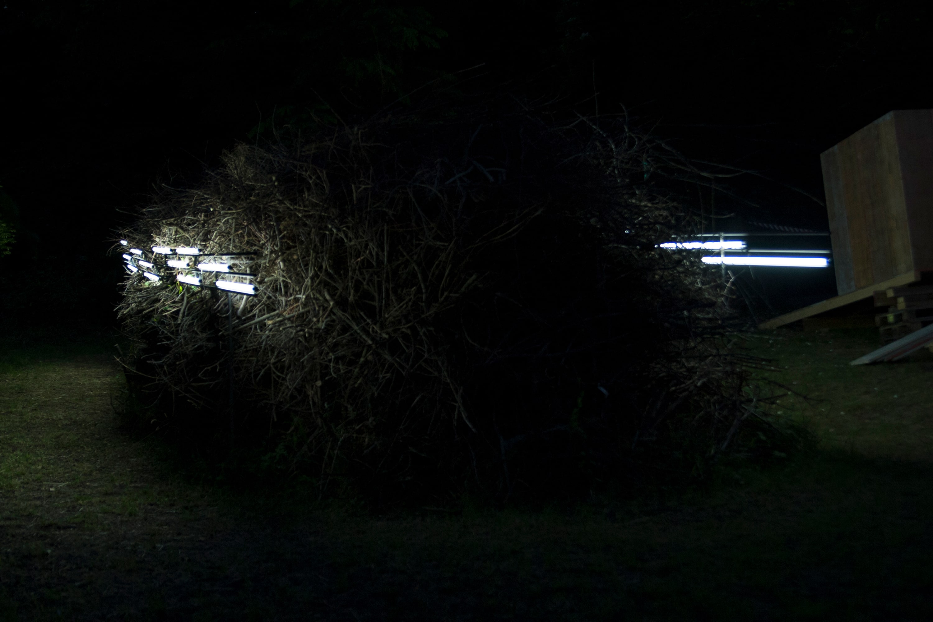 FUSSNOTEN ZUR WILDNIS ist ein Eingriff in die Betriebsabläufe der Agrarwirtschaft. Das Schnittgut eines Winters aus der Region ist im Arboretum zu einem Wall aufgeschichtet worden. Die Lagerung dieses einst sprießenden Materials inmitten der umliegenden Bäume wird von beiden Seiten durch eine Reihe von Lichtröhren beleuchtet. Die Lichtlinien durchschneiden mühelos das ungeordnete, wilde Dickicht der Äste. Während das stark verwobene Material von einem zeitlichen Endpunkt des Wachstums stammt, greifen während der dreimonatigen Lagerung im Sommer/Herbst ganz andere Zeitlinien. Einheimische Kletterpflanzen beginnen, das Dickicht zu erklimmen und zu durchwachsen, Vögel sind auf der Suche nach Nistplätzen oder Unterschlupf. Würde man die Lagerung zeitlich verlängern, würde sie sich selbst auflösen, während neues Wachstum das Gelände längst erobert hätte. FUSSNOTEN ZUR WILDNIS eröffnet eine Passage, in der sich gegensätzliche Zeitlinien verbinden.