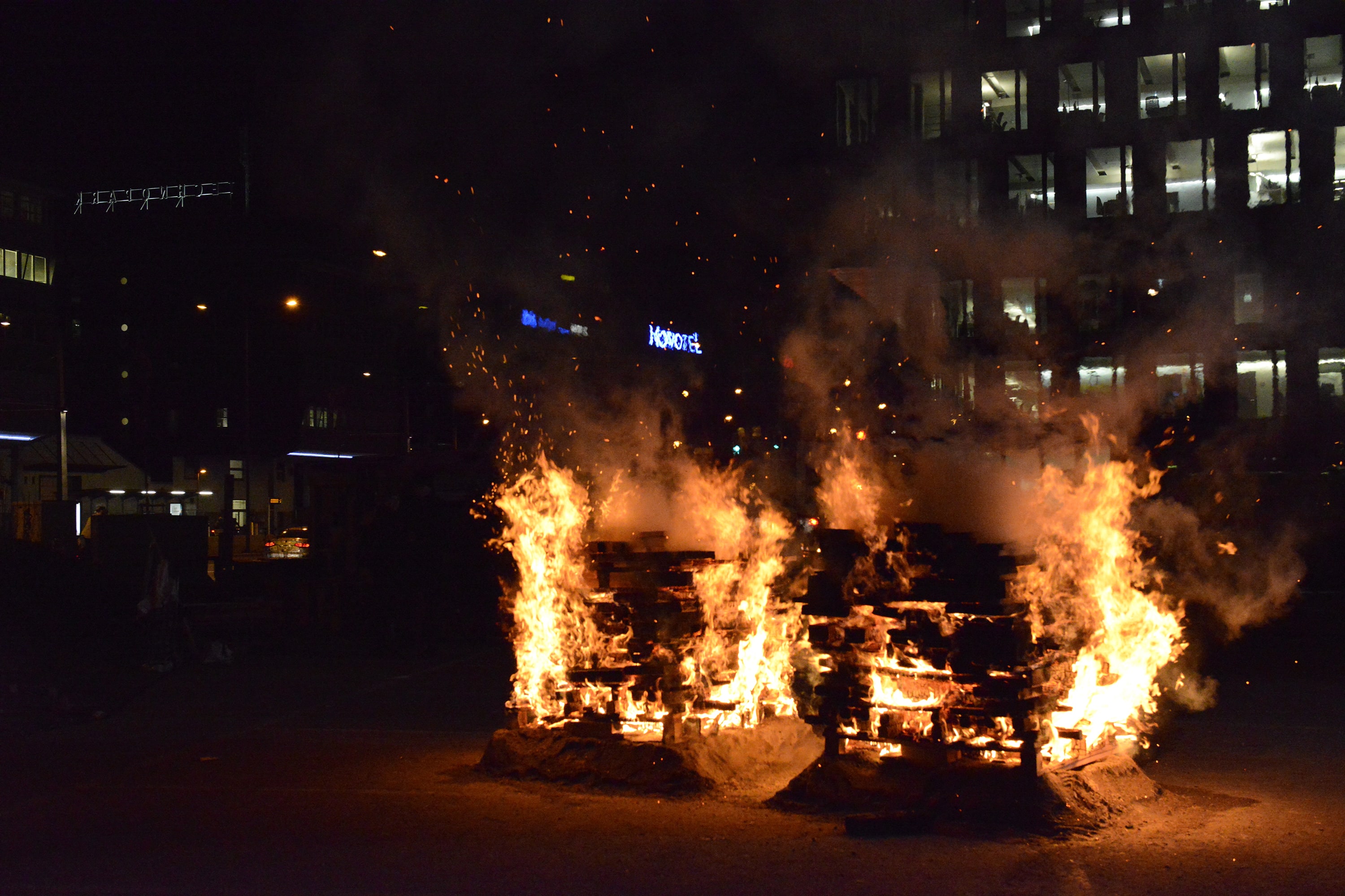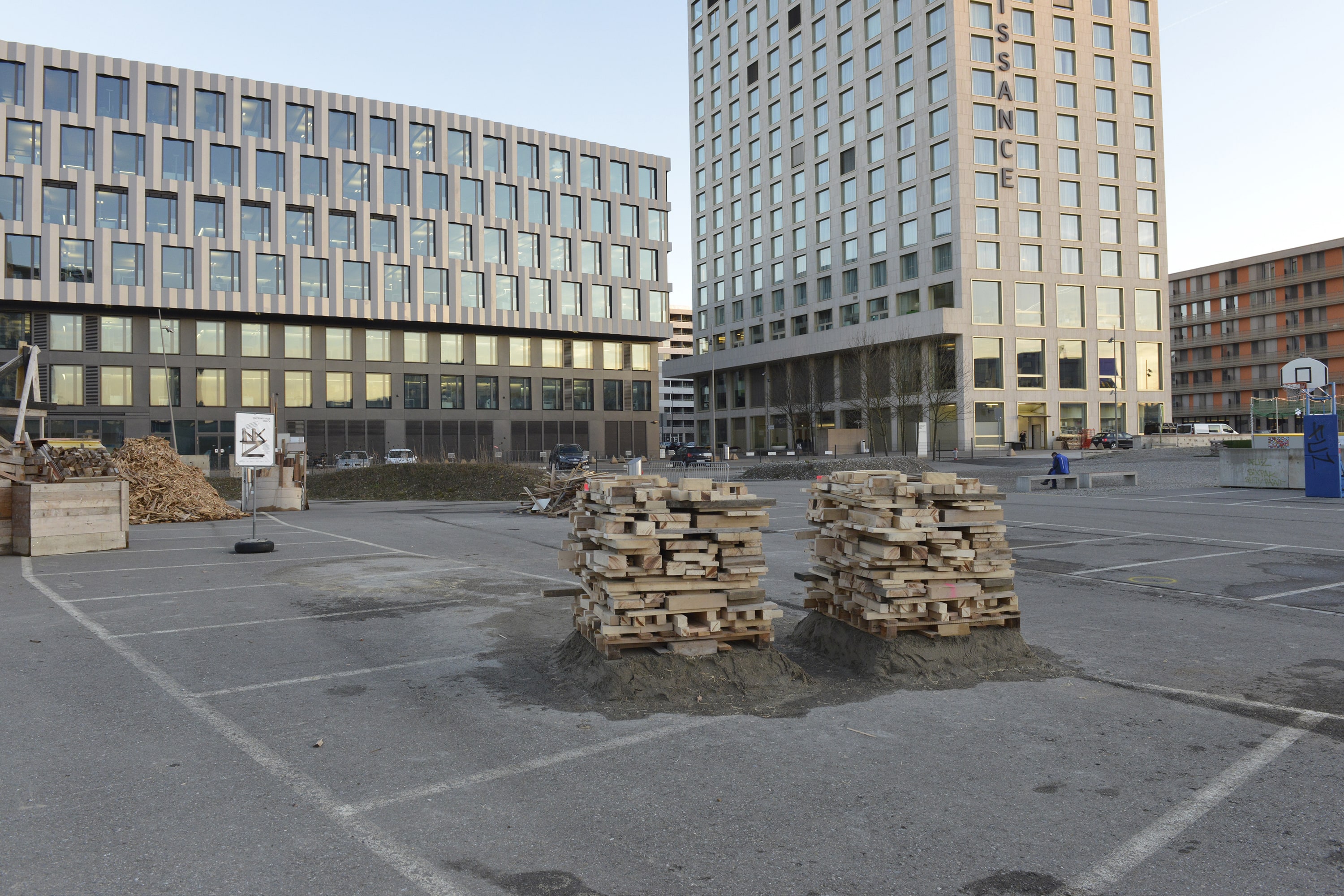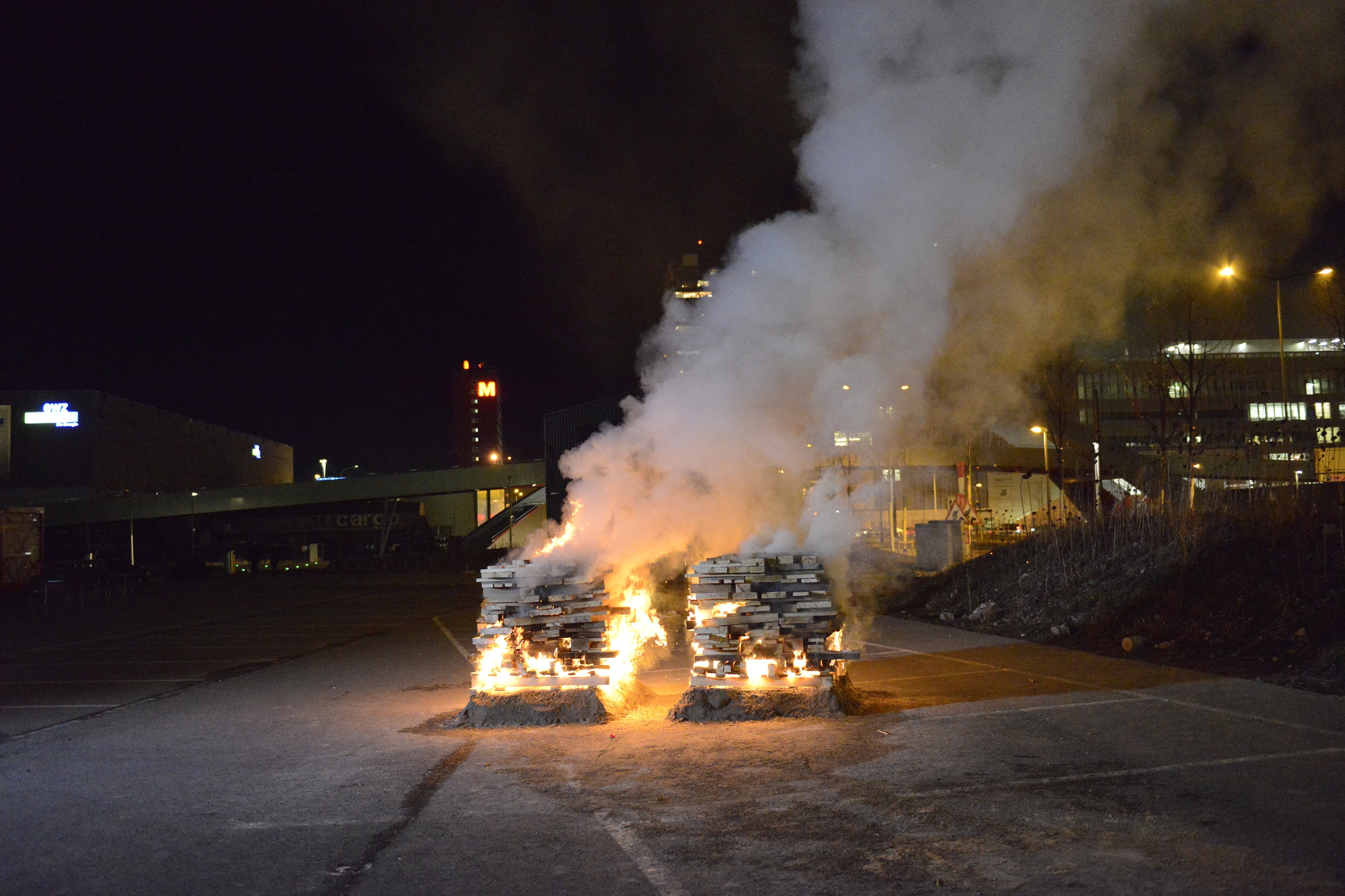 Am 5.2.2016 wurden zwei identische Holzstapel gleichzeitig in Brand gesetzt: Die Neue Kunsthalle Zürich stellt den Künstlerinnen und Künstlern jeden Monat einen vollen Container mit altem Bauholz auf der Pfingstweidbrache zur Verfügung. Die gesamte Holzmenge wurde Stück für Stück halbiert und simultan zu zwei identischen Stapeln aufgeschichtet, um diese zeitgleich in Brand zu setzen.