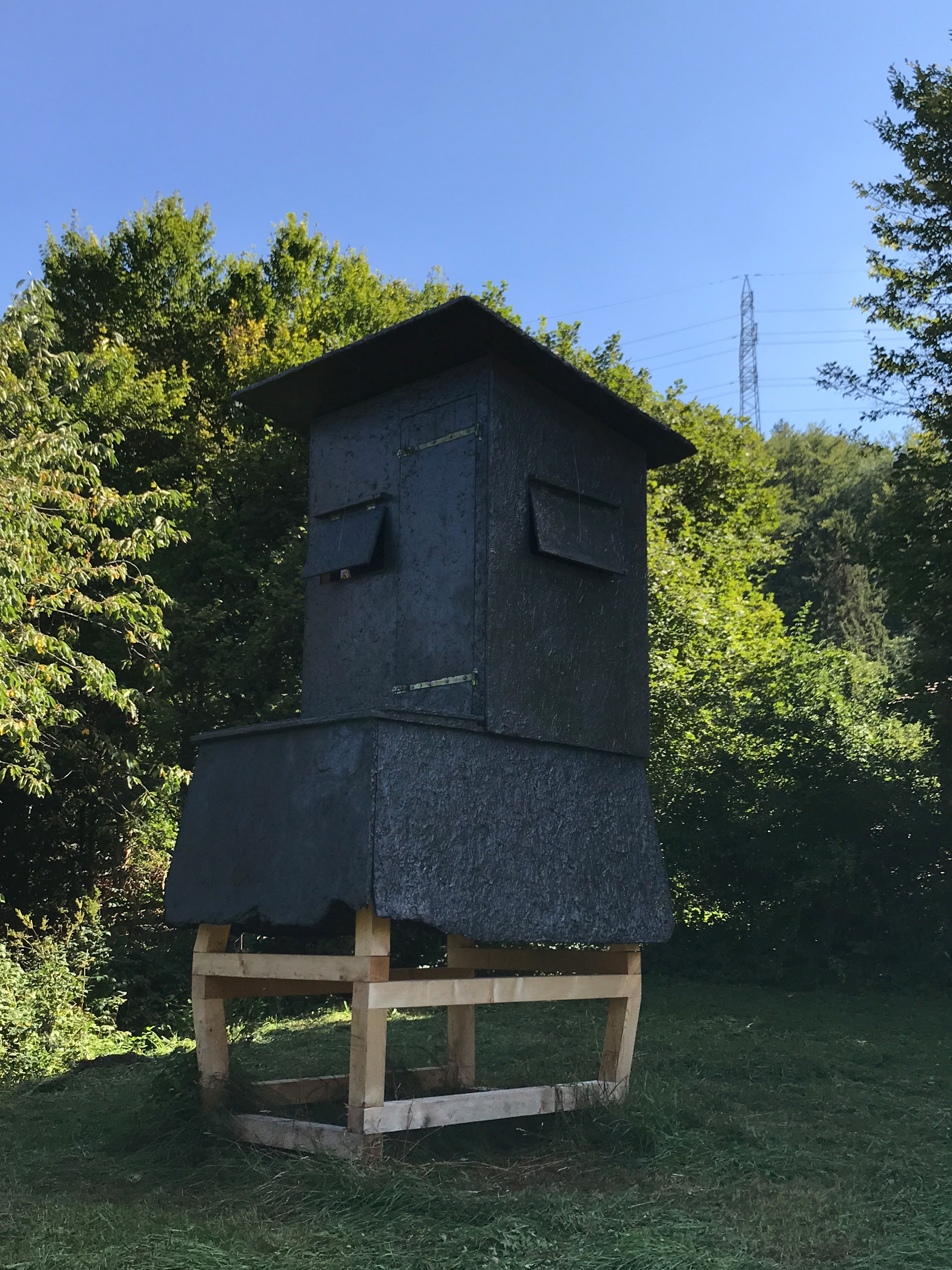 Jagdhochstand mit Tarnkappenbeschichtung (Stealth), 400 × 170 × 225 cm, Holz, Filz, Plexi, Epoxy mit radarabweisenden Inhaltsstoffen.