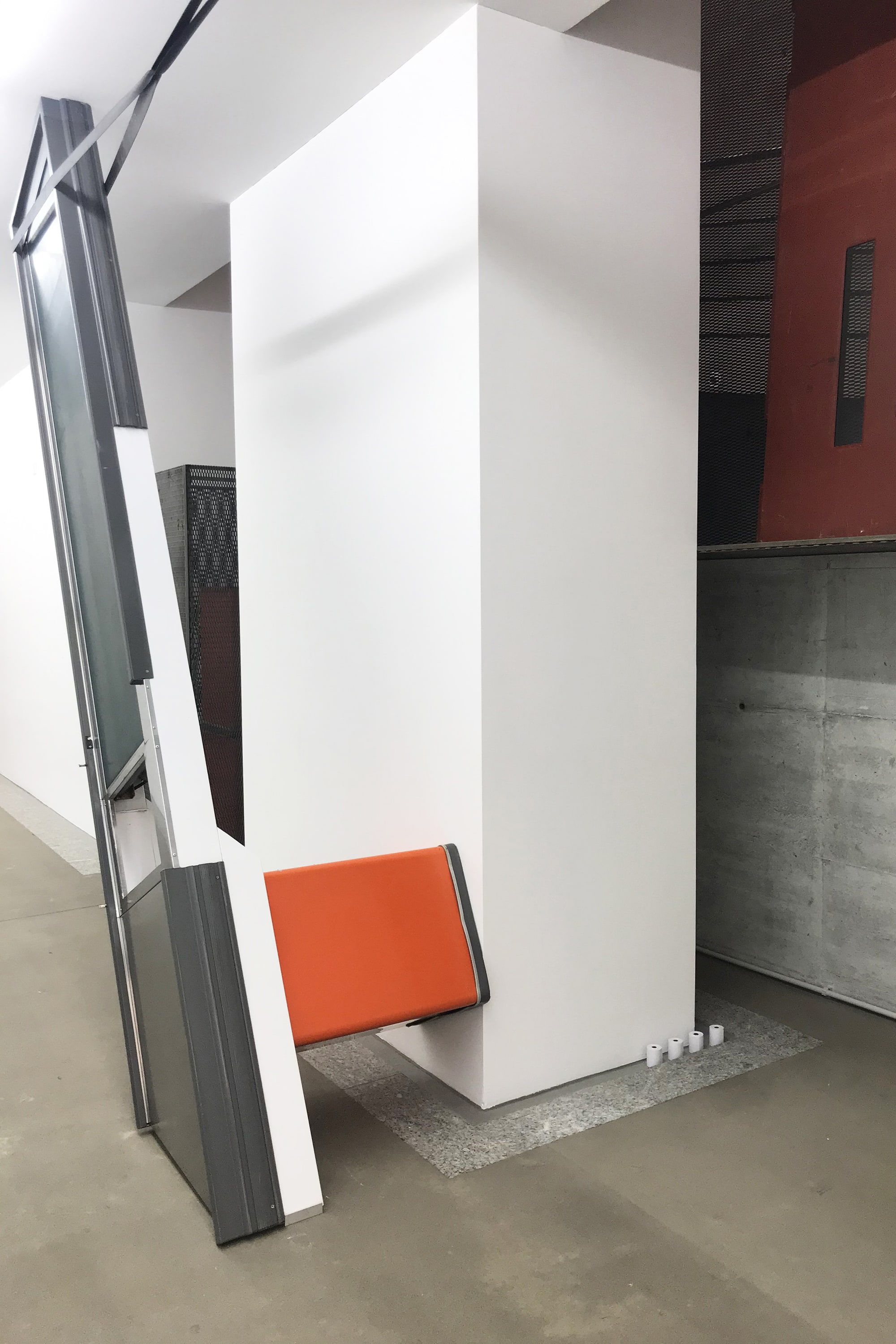 Bei diesem Projekt handelt es sich um die zweite Version von "Equation of Loss", die in einen architektonisch komplexen Durchgang mit drei Stützpfeilern und einem rückwärtigen Freiraum zur erhöhten Zugangsrampe eingefügt wurde. Die einzelnen Elemente aus Warenlaufbändern, Lagergitter Trennwänden und Liftüren, sowie deren Kasserollen bilden zusammen mit der Architektur ein Ganzes, das nach und nach in Fragmenten wahrgenommen werden kann. Sie beziehen sich auf einen in Frage stehenden Warenfluss und werden in einem prekären Gleichgewicht gehalten. Die performative Skulptur ist eine Simulation, ein begehbares Modell mit realen Objekten, das auf das Verhältnis von Menschen zu Werten, auf die Bewegung von Waren, ihre Lagerung und ihre unablässige Kalkulation verweist.
