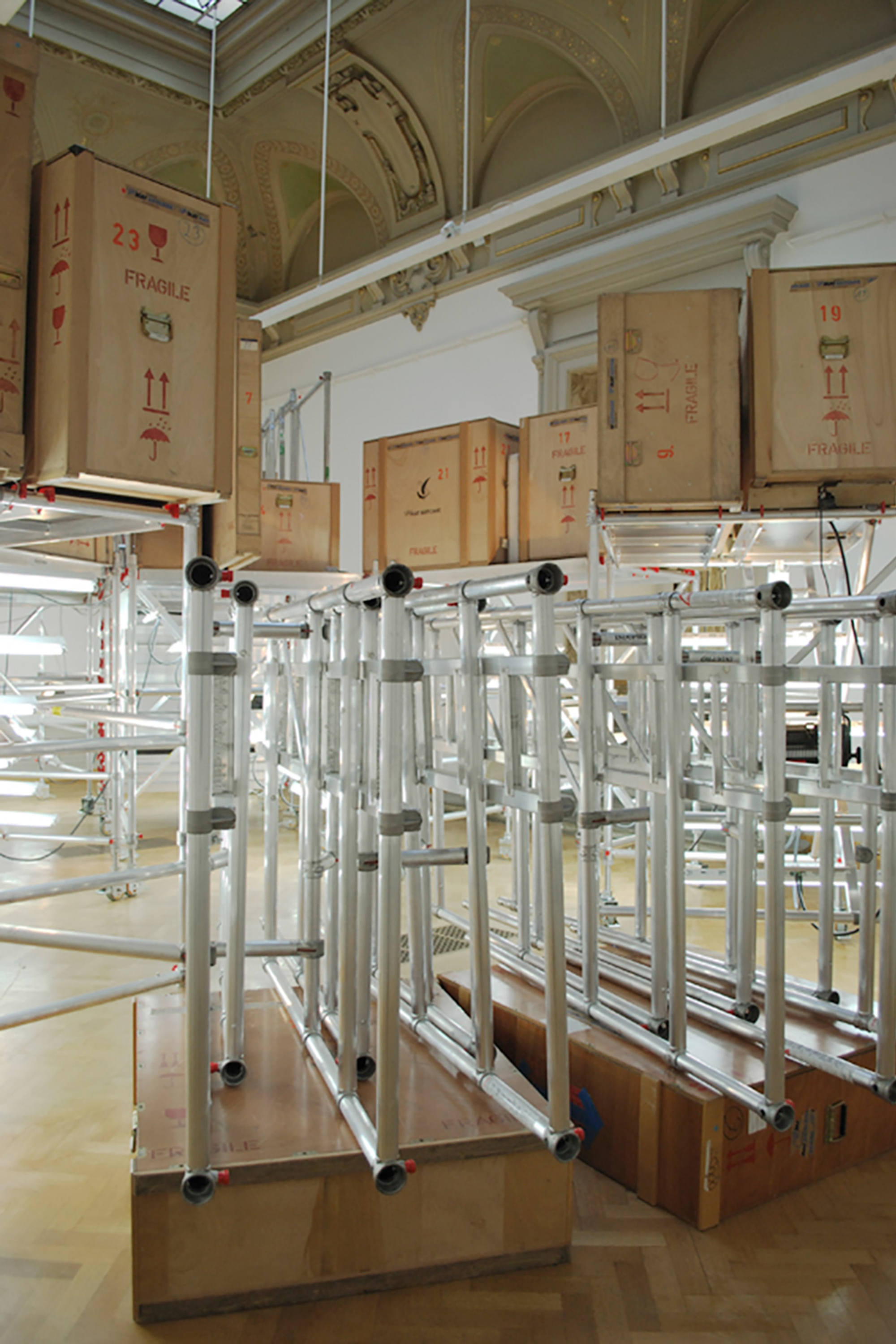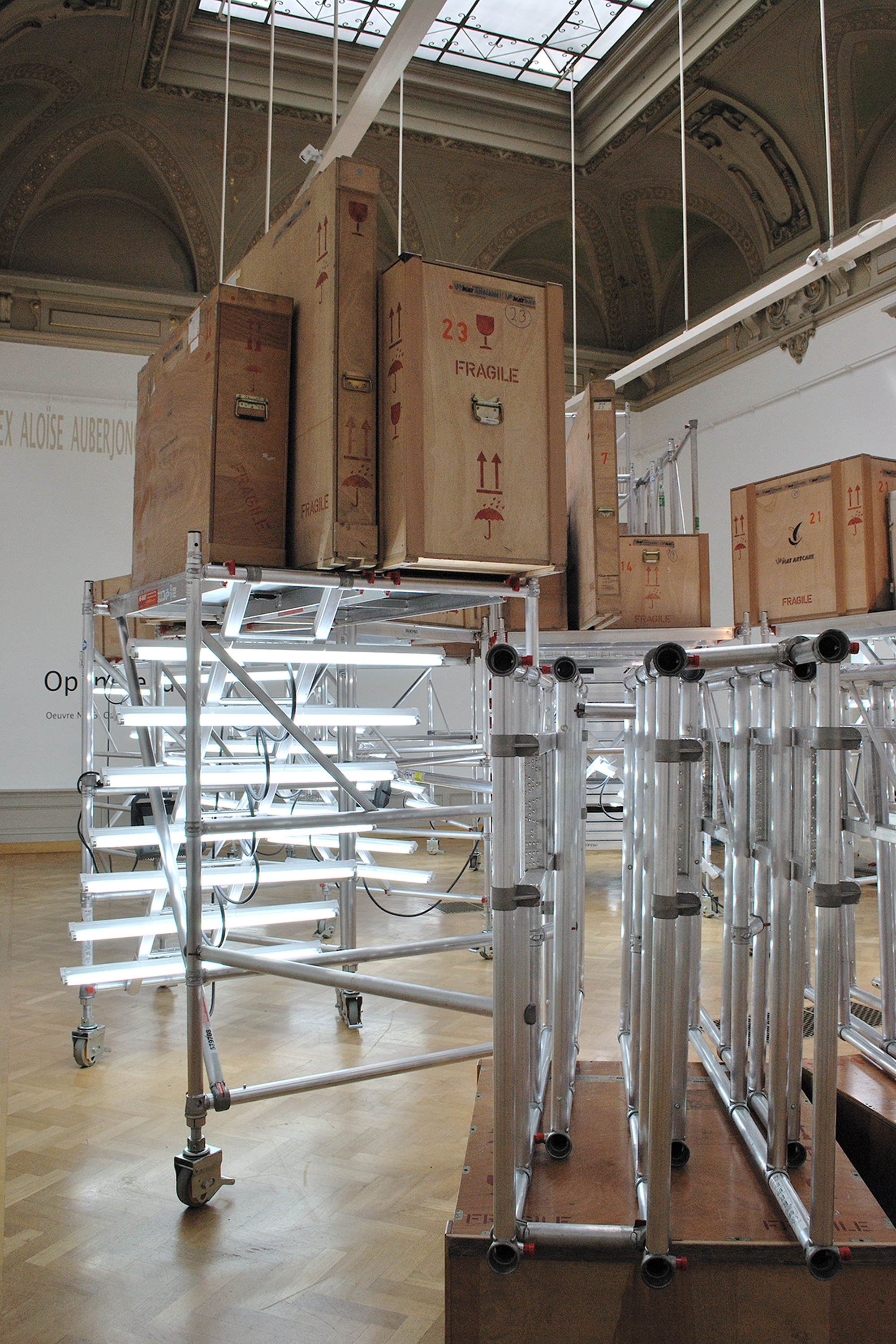 Holzkisten der Sammlung J. und S. Planque, Neonröhren und Beleuchtungskörper des Museums auf Gerüst der Marke Hi Way
