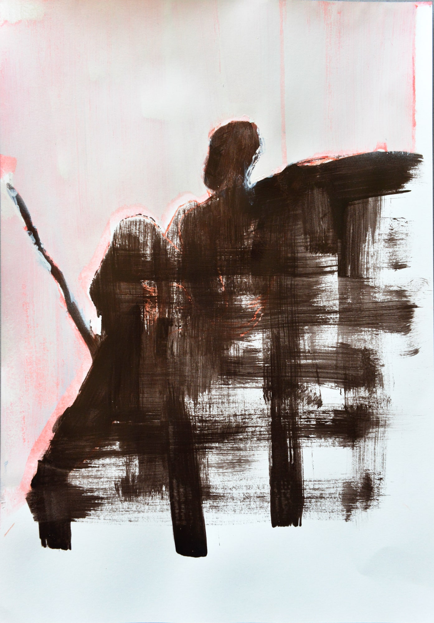 In der Serie Warte beschäftigt mich eine widersprüchliche Situation des Aufschubs im Warten, beziehungsweise die pointierte Situation des Ausgucks, einer Warte. Die Figur auf dem vorgefundenen Bilde sitzt an einem Abhang eines Stausees in Oregon. Die Serie verwendet Schablonen, um das Bild auf unterschiedliche Weise zu übertragen. Dabei kommen unter anderem Lack, Tinte, Buntstifte und Sprühfarbe zum Einsatz. Das entstandene Bild wird so auf unterschiedliche Weise aufgeladen.